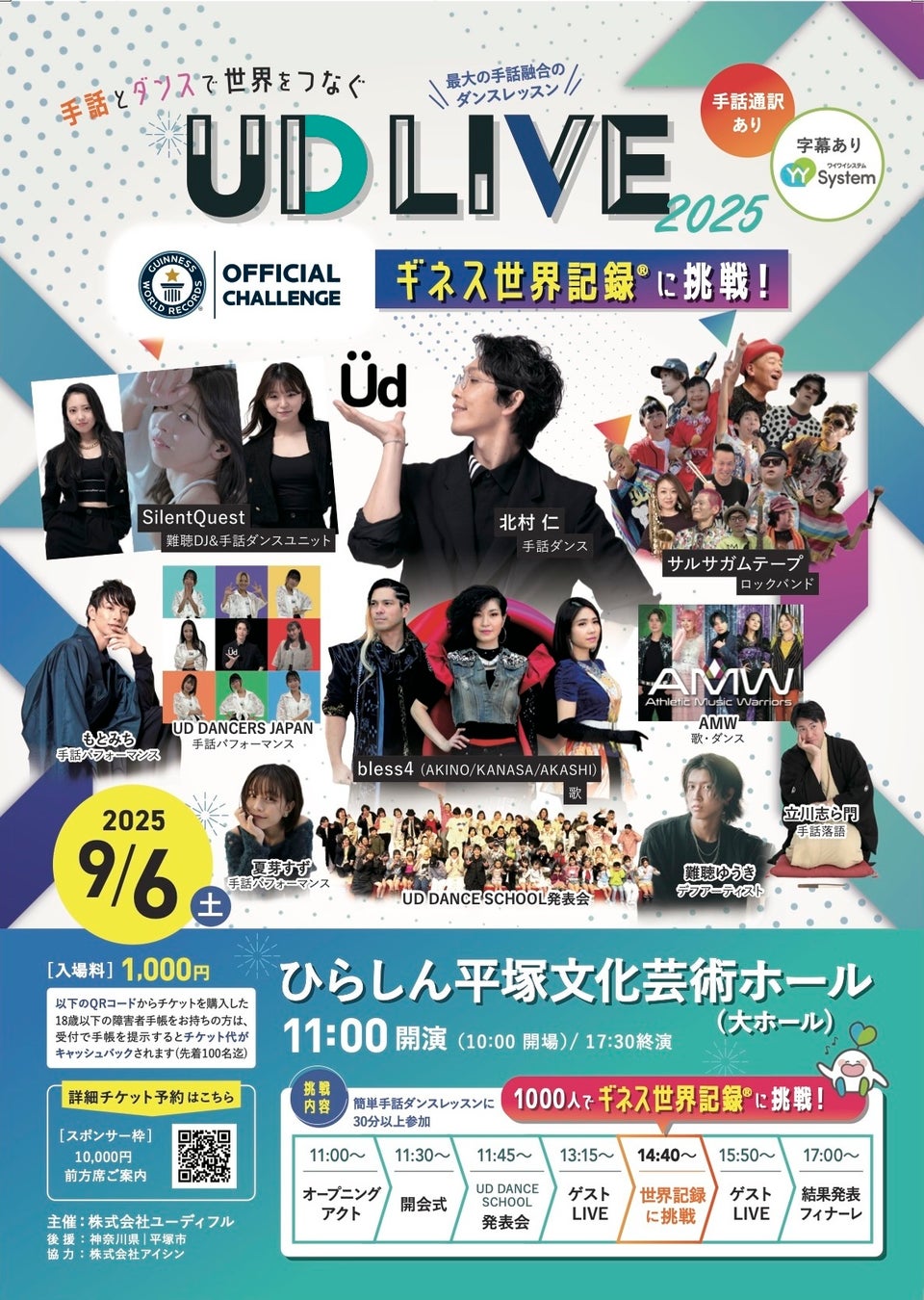 株式会社ユーディフル(所在地:神奈川県平塚市/代表取締役:北村 仁)は、9月6日(土)に主催した「UD LIVE 2025」において、“最大の手話融合のダンスレッスン”でギネス世界記録™更新に挑戦しました。本イベントは、エンターテイメントを通じて障がいの有無にかかわらず人々が集い、共に新しい記録を目指すことの価値を証明するために開催しました。当日の様子を以下の通りレポートします。