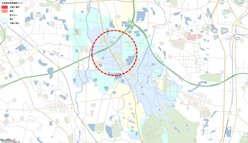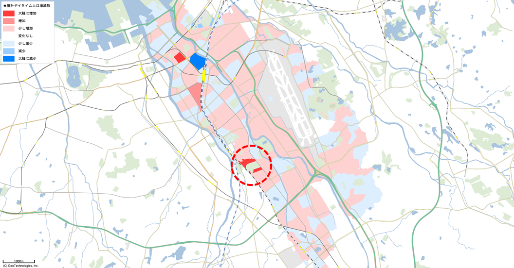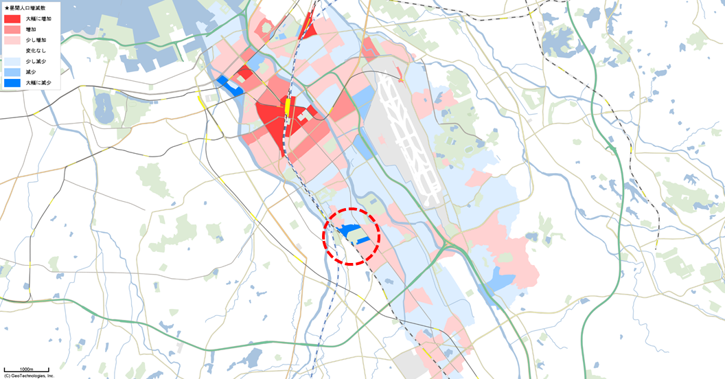 図3の推計デイタイム人口データの結果と図4の昼間人口の結果を比較して、大きな変化がある地域(赤円)を示しています。