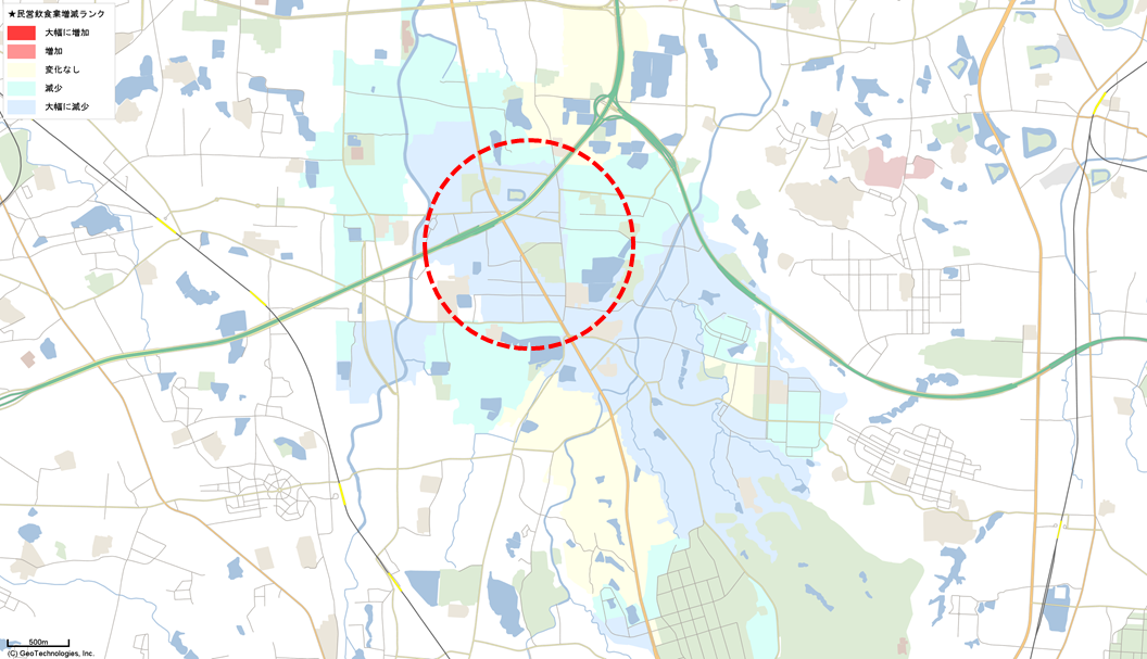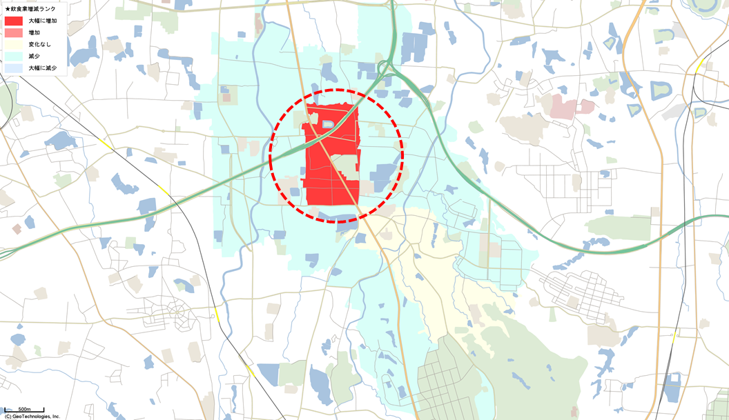 下図は大阪府堺市美原区周辺の飲食店数の変化を直近と前期のデータで表したものです。
