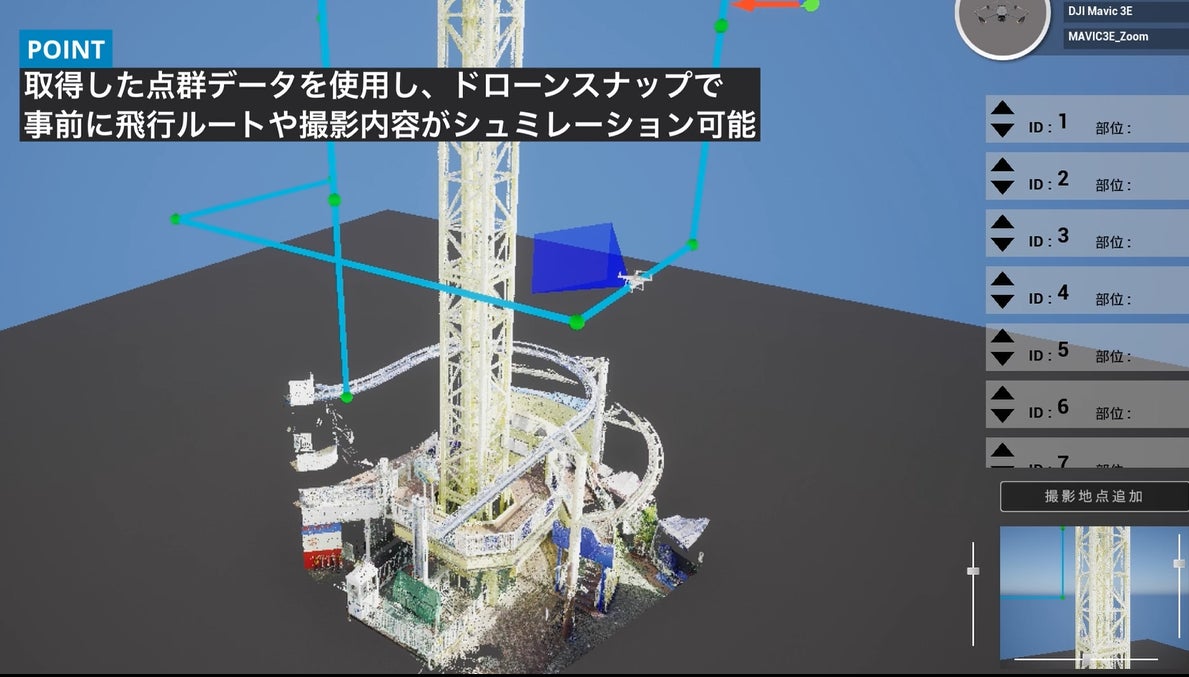 スペースショットの3次元点群データをベースに、ドローン自動飛行ルートを生成。撮影ポイントも明確にし、ドローンを自動飛行させ、写真および動画で点検データを取得した。
