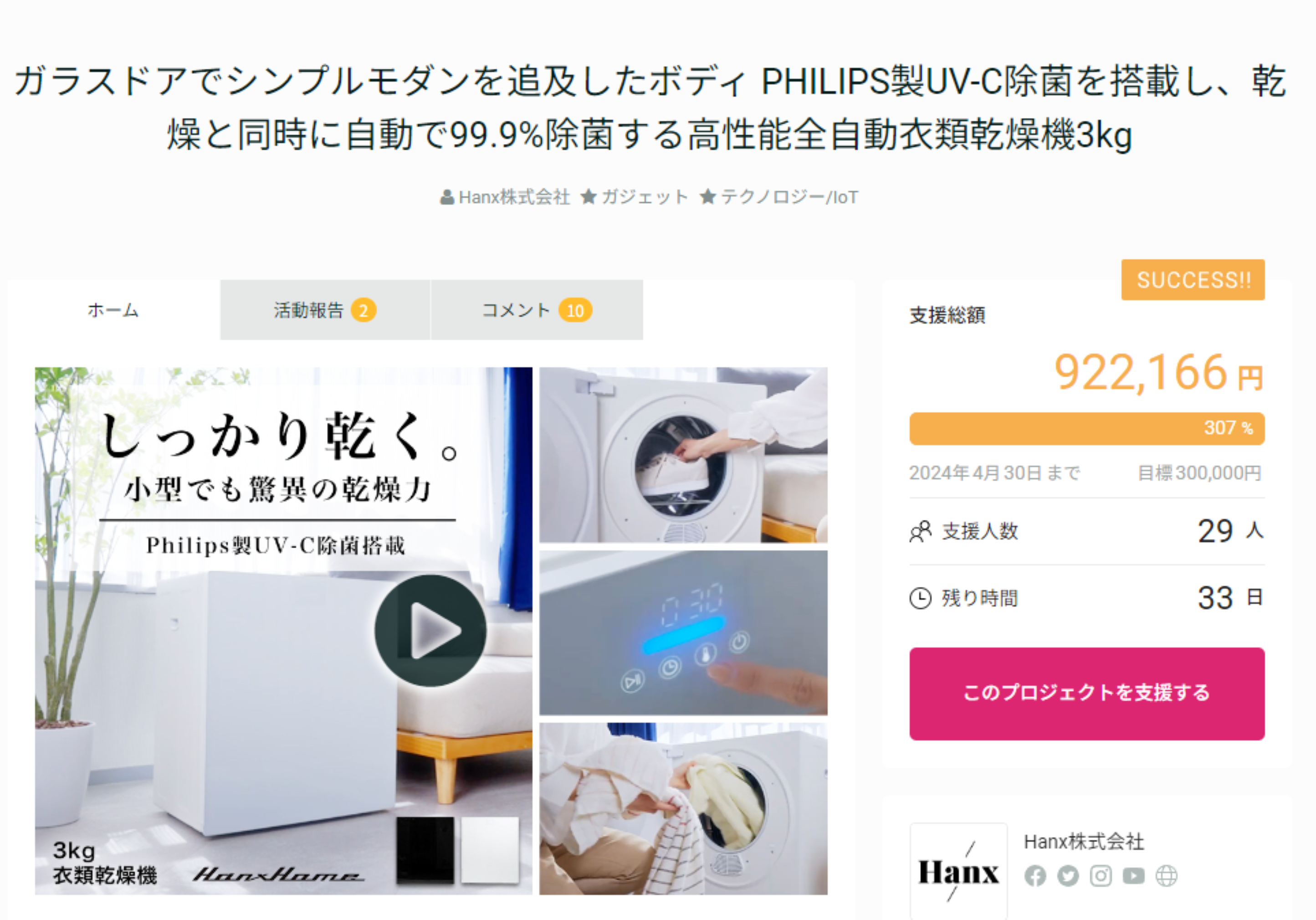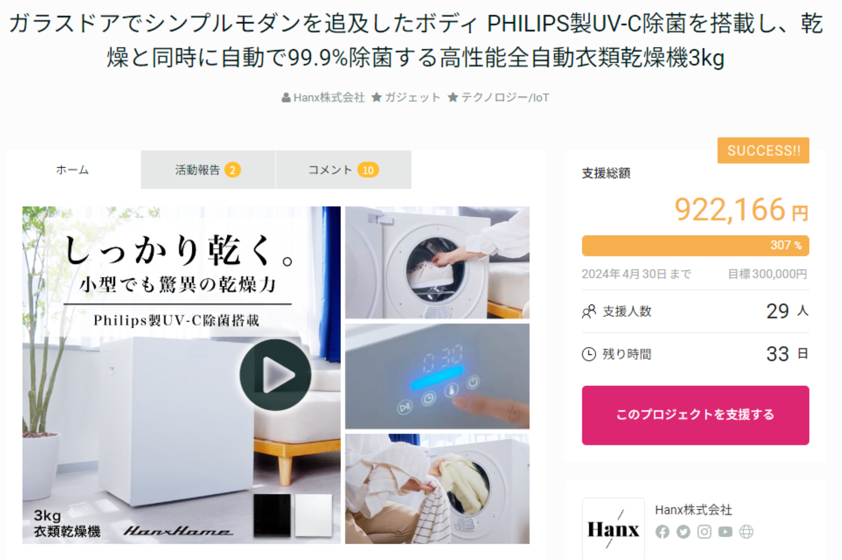 【300%達成!】Hanxのしっかり乾く衣類乾燥機が、GREENFUNDING公開から僅か1週間で達成率300%超え