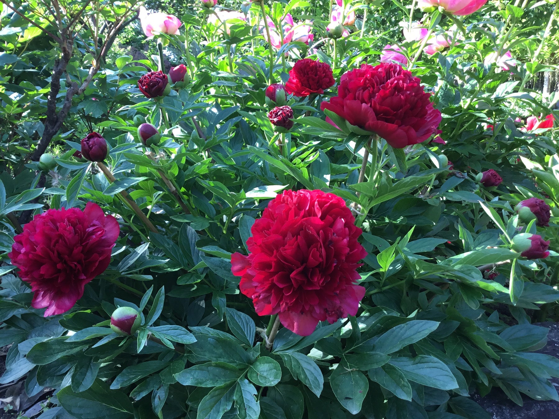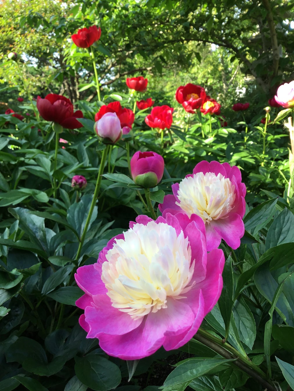 色彩が鮮明なシャクヤクとハイブリッドシャクヤクとの調和が楽しめる。