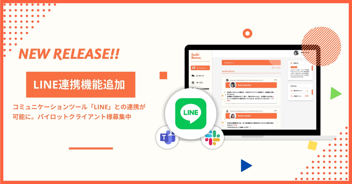 チャレンジを促進する組織エンゲージメント向上サービス『Sushi Bonus』を提供する株式会社Polycome(本社:東京都板橋区/代表取締役:行比拓也)は、コニュニケーションツール「LINE」との連携に伴いパイロットクライアント様を5社募集します。