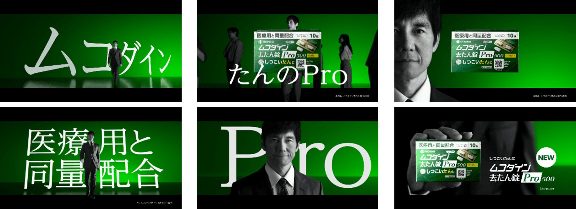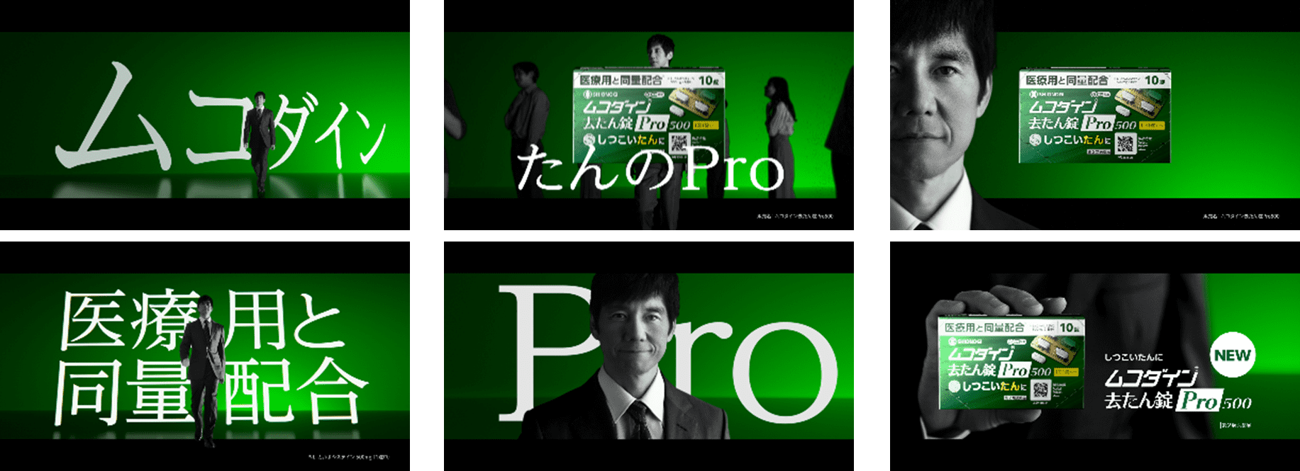 今回の新Web CMでは、医療用と同量配合でかぜの諸症状・せき・たんに対応できるProシリーズの信頼感・本格感をブランドメッセンジャーの西島さんが全身で表現。「ムコダイン去たん錠Pro500」のカラーである“緑”に統一されたブランドのカラーリングと、重厚感のある西島さんの仕草や表情、声の相乗効果で堂々としたWeb CMに仕上げました。