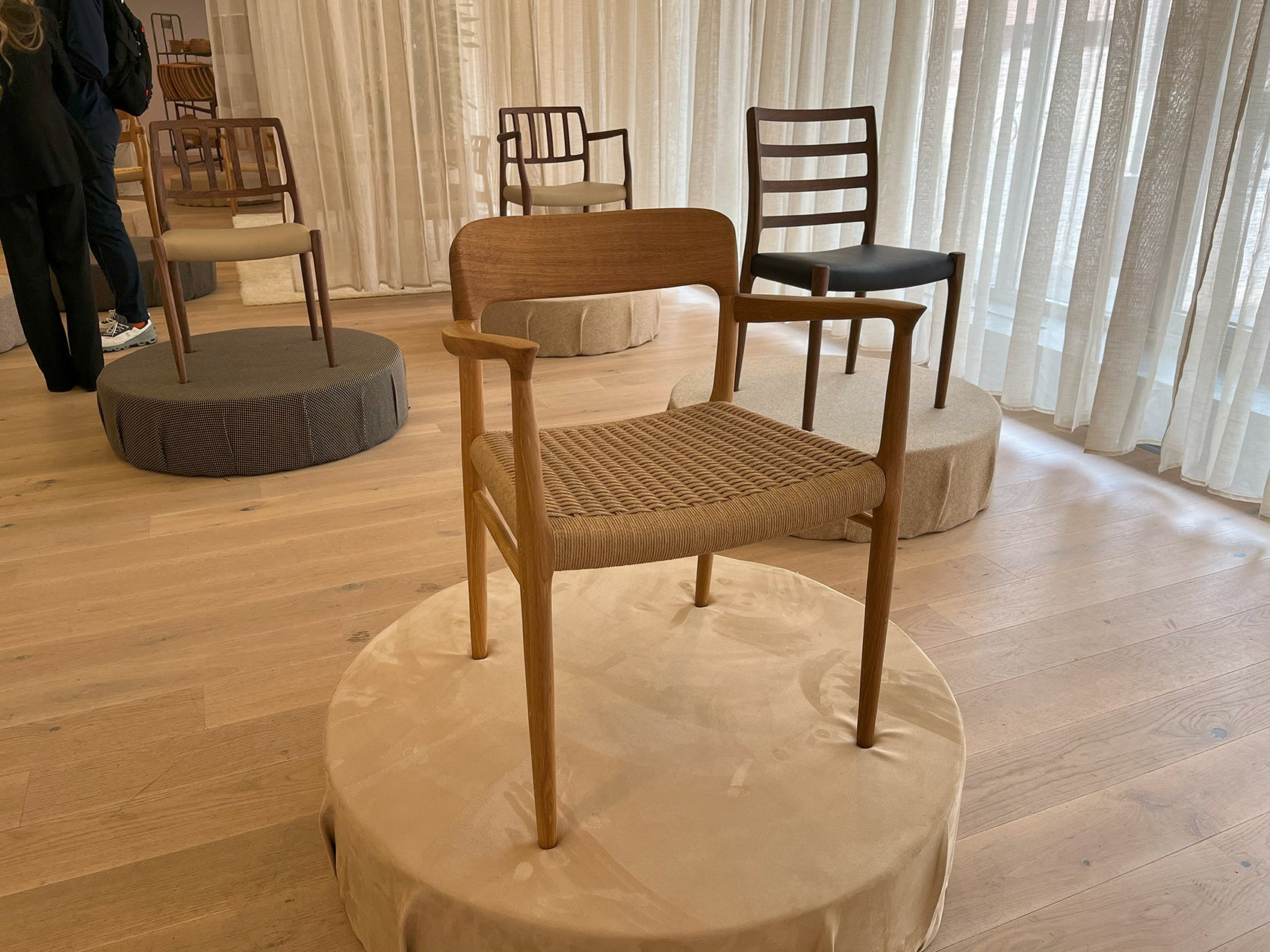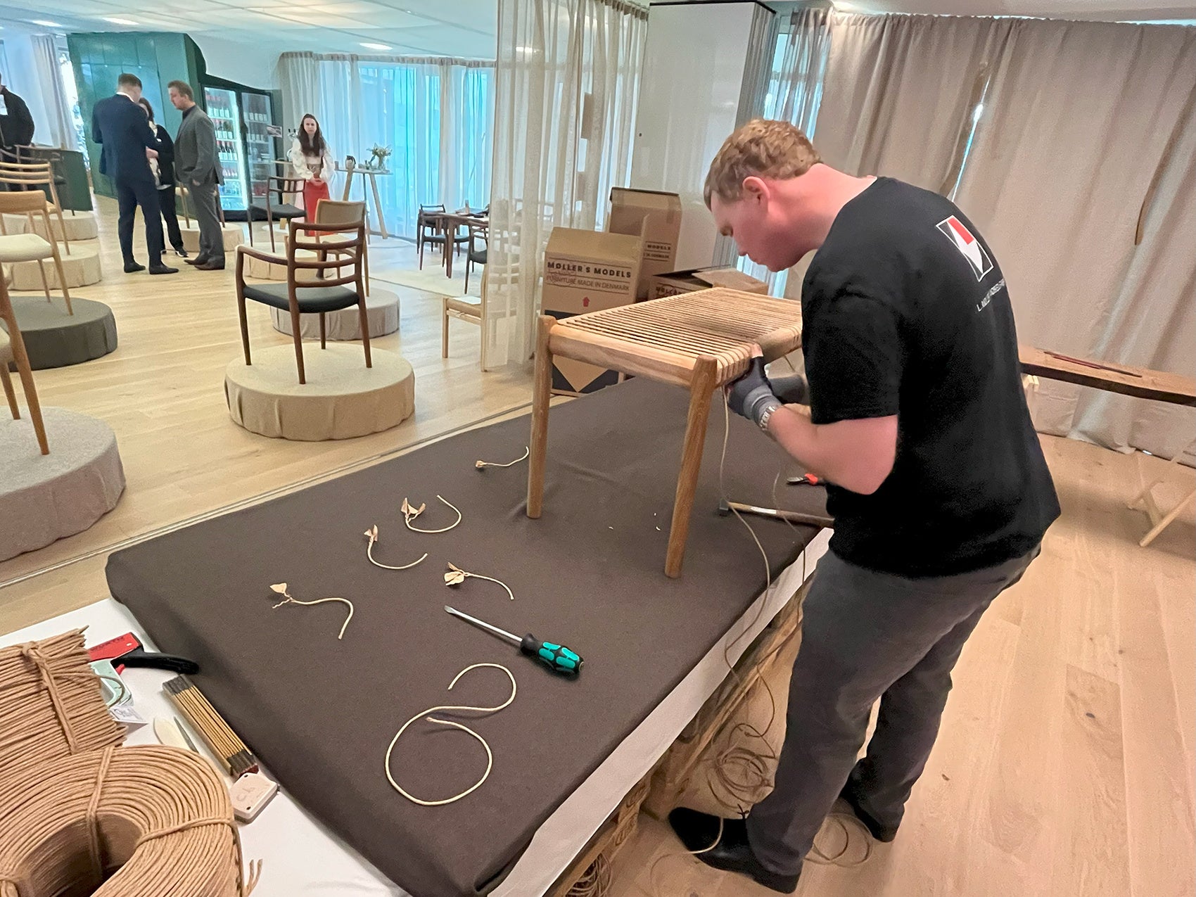 そしてJ.L.mollers再訪。この、全モデルが展示されている特別な機会に、改めて一つ一つの作品を丁寧に拝見し、撮影させていただきました。1961年に建設された時と同じ工場で生産を続けているというJ.L.mollersは、今回その工場の一部と職人の方をそのまま展示会に連れてきてくださり、ペーパーコードの張りの技術を実演してくれました。J.L.mollersのペーパーコードの張り方は"平編み"、"鹿の子編み"等と呼ばれています。フレームの内側に釘を等間隔に打っておき、職人の方はそこにコードを引っ掛けていくように規則的で静かに正確なリズムで張りを進めていきます。時折調整の為にトントン、とコードを整える様を見ていると時間を忘れてしまいそうでしたが、名残惜しさを感じながらも会場を後にしました。