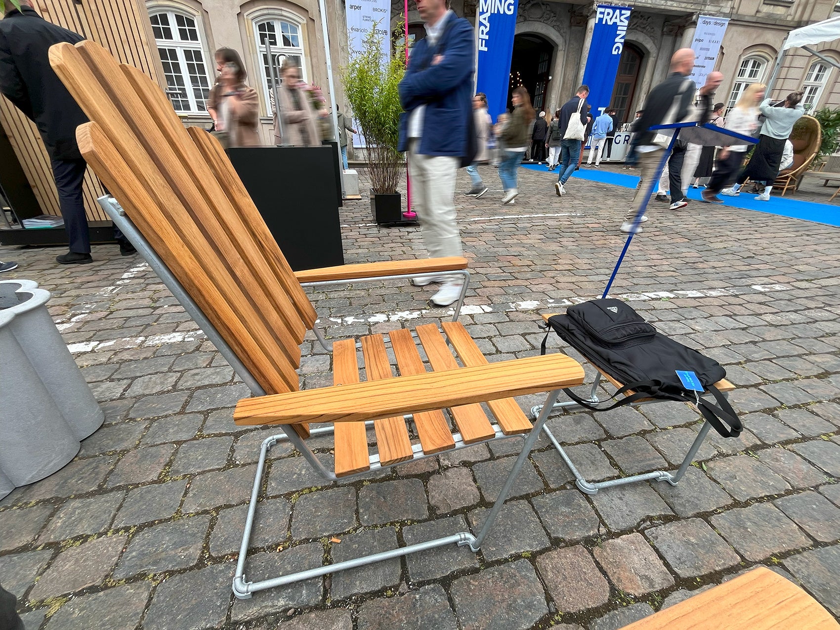 邸宅の前庭には様々なアウトドアファニチャーが並び、来場者は思い思いに座り、くつろぎ、座り心地を確かめていました。弊社が特に注目したのがスウェーデンのアウトドアメーカー、Grythyttan Stalmoblerの"SUNLOUNGER"というリクライニングチェアで、座り心地も素晴らしく、安定感のある形とOiled Oakの優しい木目のスレッドの座面が、これからの季節にぴったりと感じました。