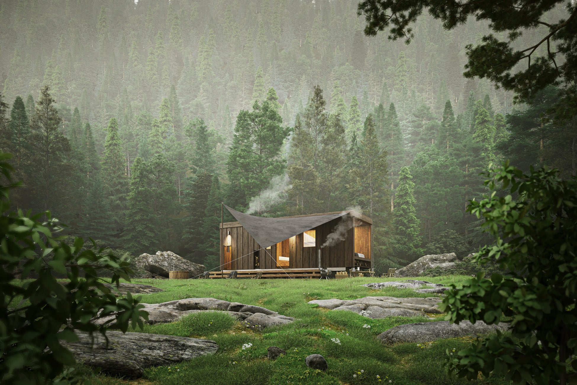 「Earthboat 2」はEarthboatの最大の特徴であるCLTの駆体構成と、大開口により切り取られる絶景の体験をそのままに、フラットルーフを採用することで周辺環境との水平的な繋がりを強調したデザインへと一新している。タープの軽やかな屋根の下をアウトドアリビングとして位置づけ、滞在者の活動と周辺の広大な自然との接点を生み出す。この「Earthboat 2」が様々な土地に置かれ、各地で新たな風景を形作っていくことを心待ちにしている。