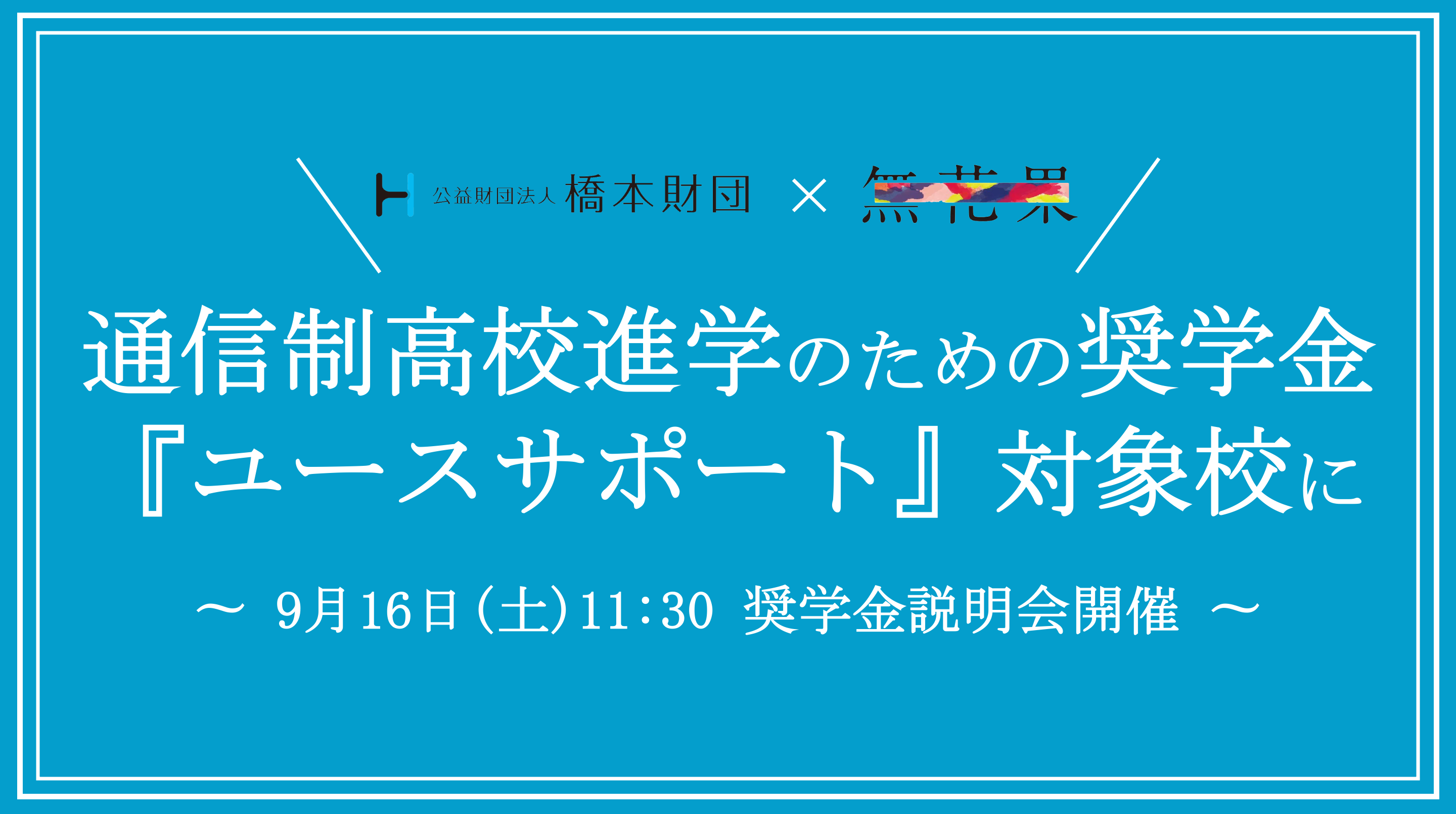 無花果株式会社(所在地:岡山県岡山市 代表取締役:中藤寛人、以下「当社」)が運営する無花果高等学園が、公益財団法人 橋本財団(所在地:岡山県岡山市 代表:理事長 橋本 俊明)が開始した通信制高校進学のための奨学金事業「ユースサポート」の対象校となりました。併せて、2023年9月16日(土)11時30分より、奨学金説明会を開催いたします。