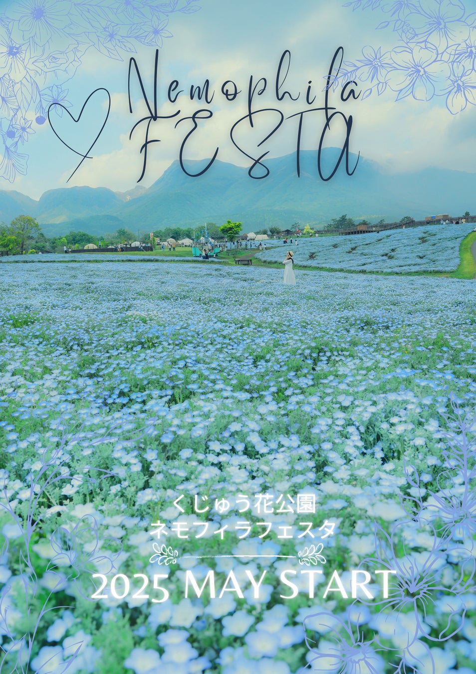 大分県竹田市の「くじゅう花公園」では、8万株・約9,000㎡のネモフィラが5月10日頃から見頃を迎えます。