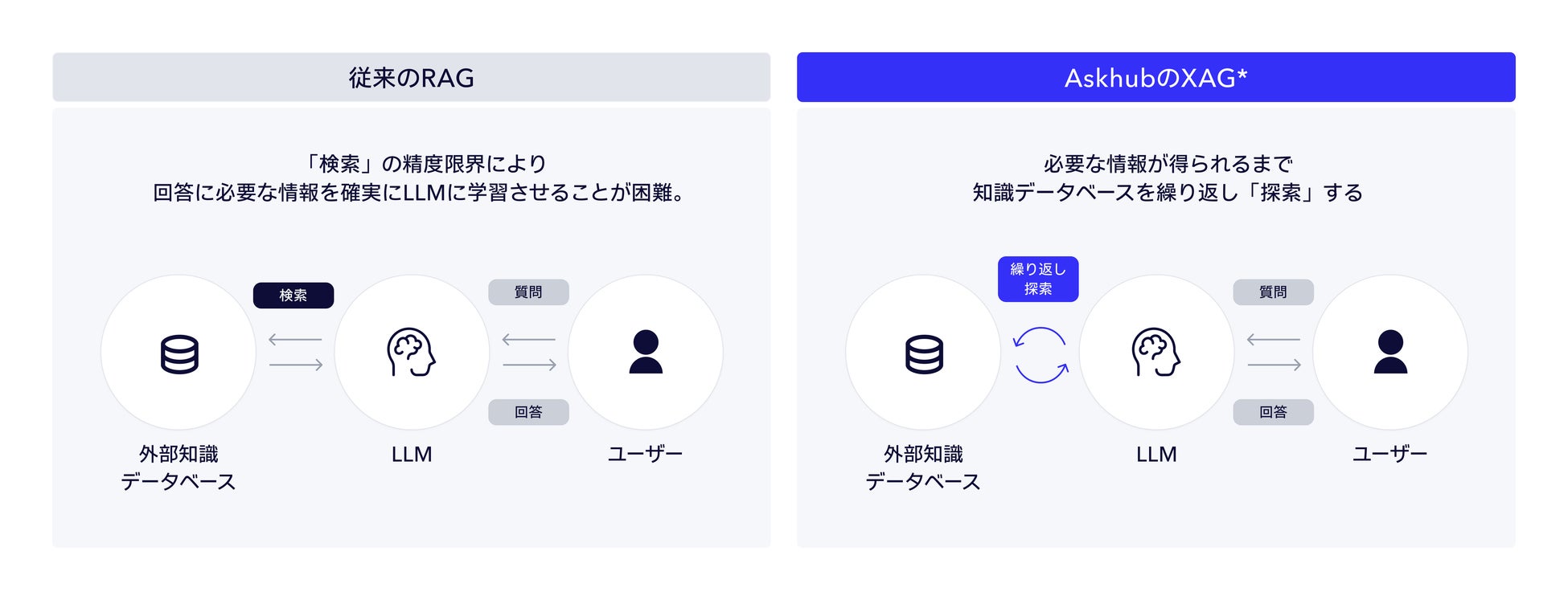 Askhubはこうした情報探索をより効率的に実現するために構築されました。このシステムは、従来のRAGモデルを進化させた「Exploration-Augmented Generation」(XAG)と名付けられた新しいアプローチを採用しています。XAGモデルでは、情報の「検索」だけでなく、それが回答のために本当に必要かどうかを理解し、「探索」しながら最適な情報源へと導く能力を有しています。