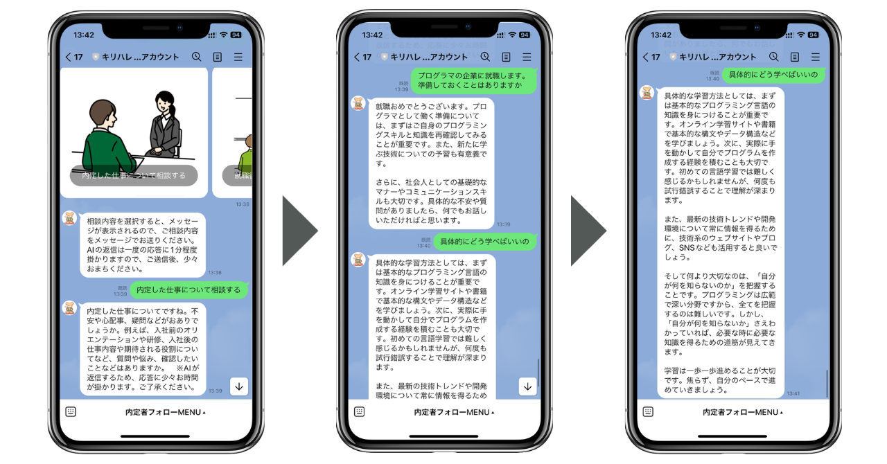 電話やメールなど形式的なやりとりが必要とされる媒体は、社会人経験のない学生にとって利用のハードルが高いものです。一方、AIが相手だったり、LINEなど身近なチャットツールを使ったりすれば、内定先へ相談する心理的負担は下がり、適切なコミュニケーションが取りやすくなります。
