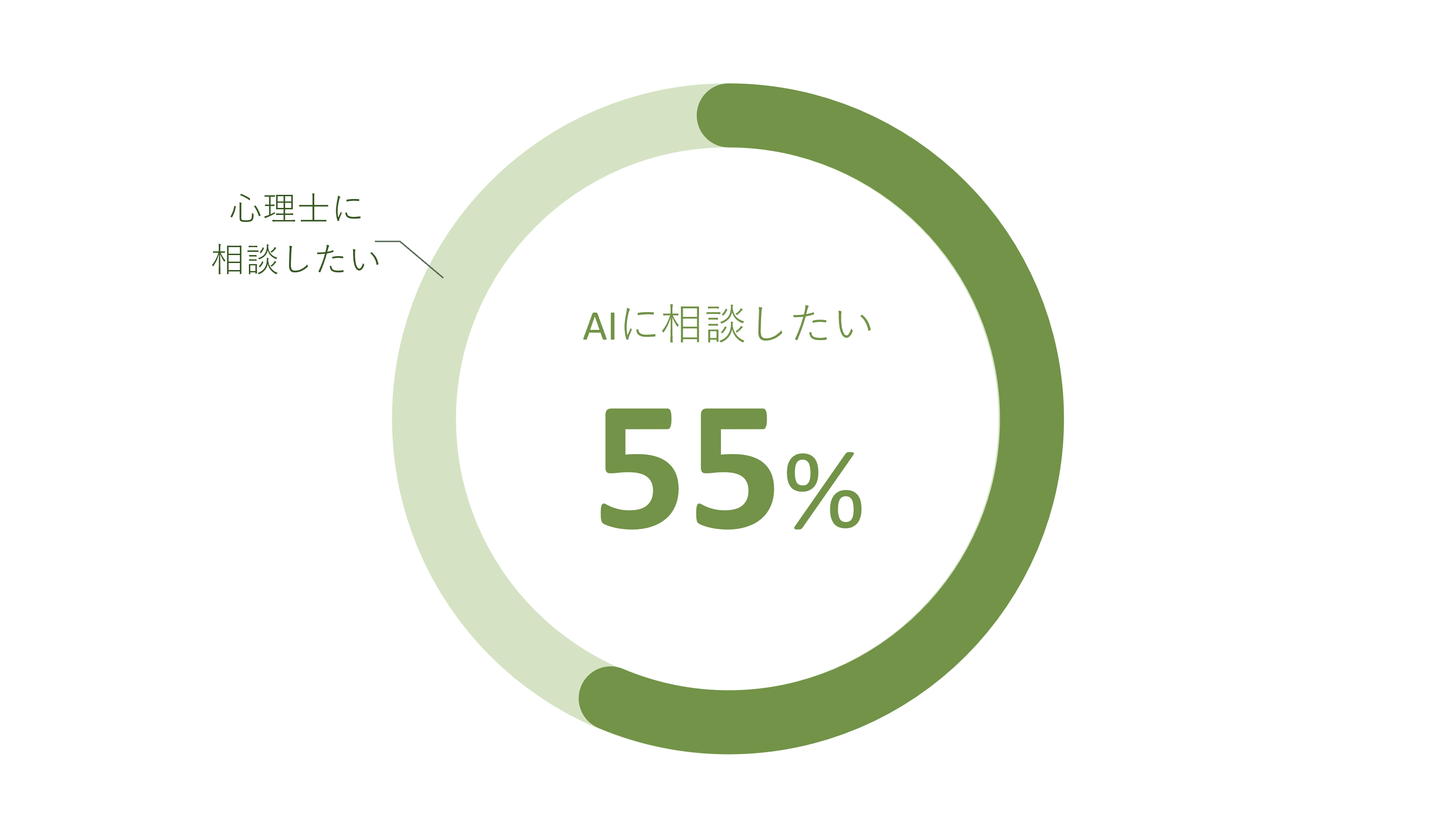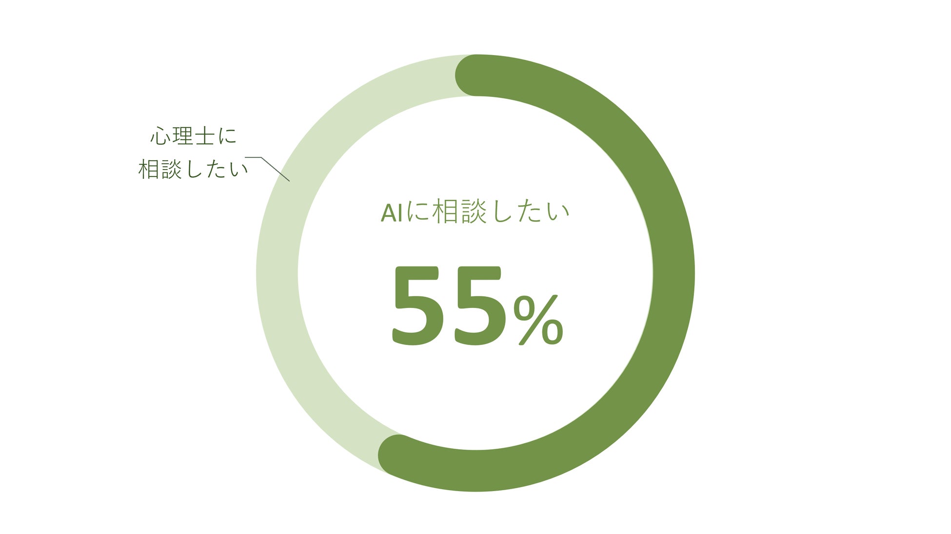 日本には、人への相談を恥ずかしいと思う文化が根強くあります。心理士とAIのどちらのカウンセリングを受けたいかのアンケート調査では、「AIによるカウンセリングを受けたい」と回答した人が55%と半数以上を占め、人への相談を選ばない傾向が表れました。誰にも相談できず内定辞退を決める内定者でも、AIであれば気軽に不安を打ち明けられると予想されます。