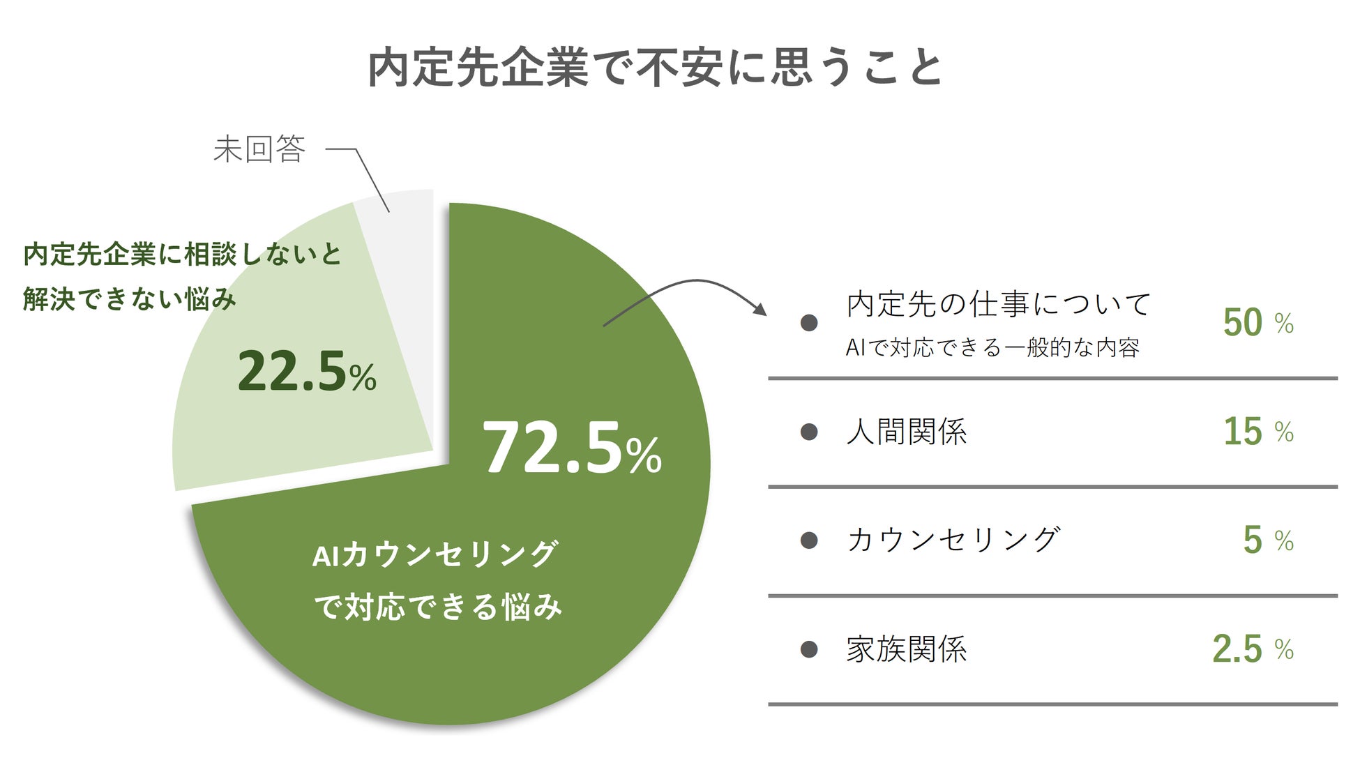 内定者を対象に「内定先企業について不安に思うこと」を調査したところ、内定先の仕事に関する一般的な悩みや人間関係など、72.5%がAIカウンセリングで対応できるという結果が出ています。残り22.5%は、今後のキャリアや働き方、給与面など内定先企業に直接相談しないと解決が難しい悩みとなりました。