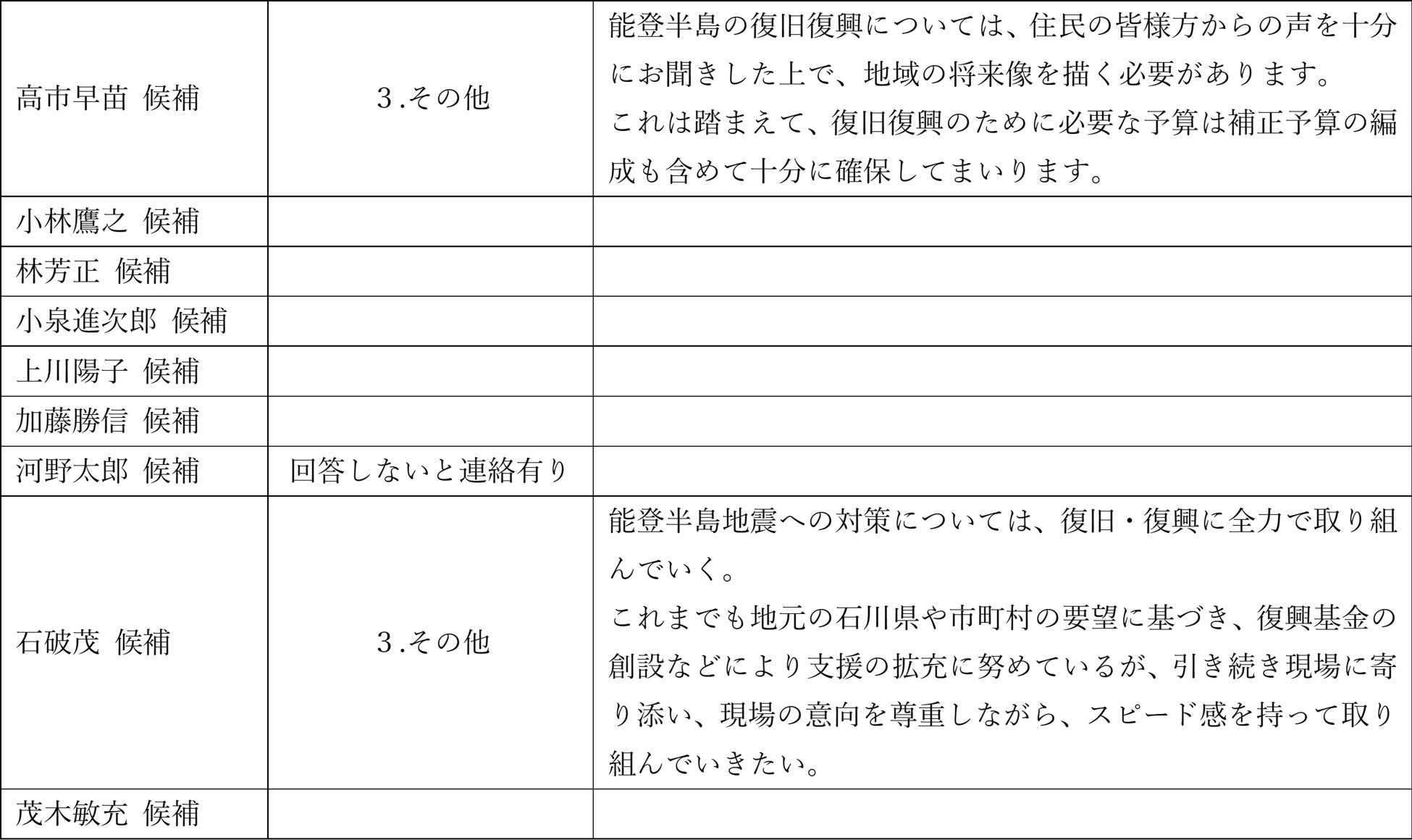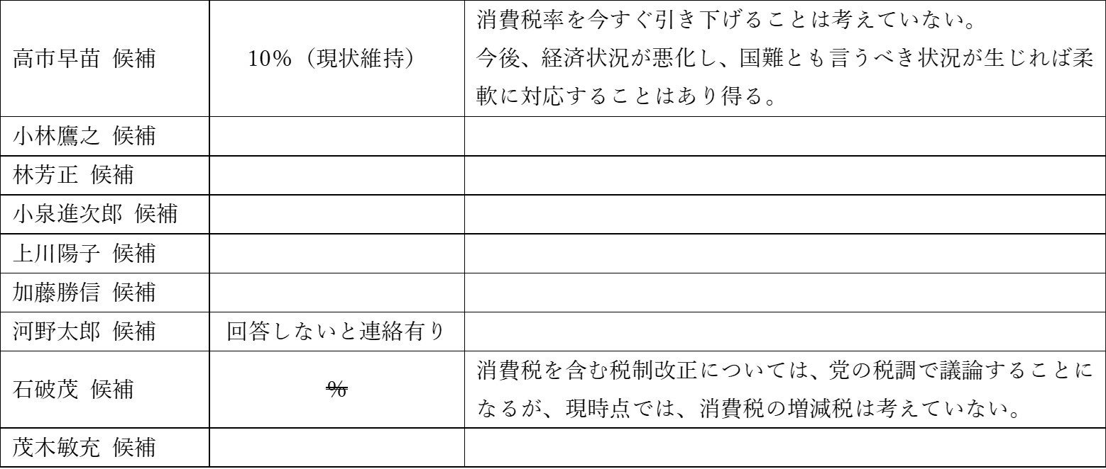 国民生活や日本経済を良くするために向かい合うべき5つの質問について、御多忙の中、3名の候補者の皆さま(高市早苗氏、石破茂氏(届出順))に御回答頂いたことに深く感謝いたします。
