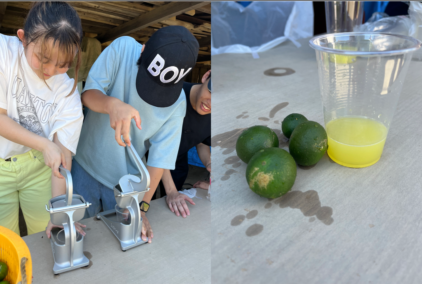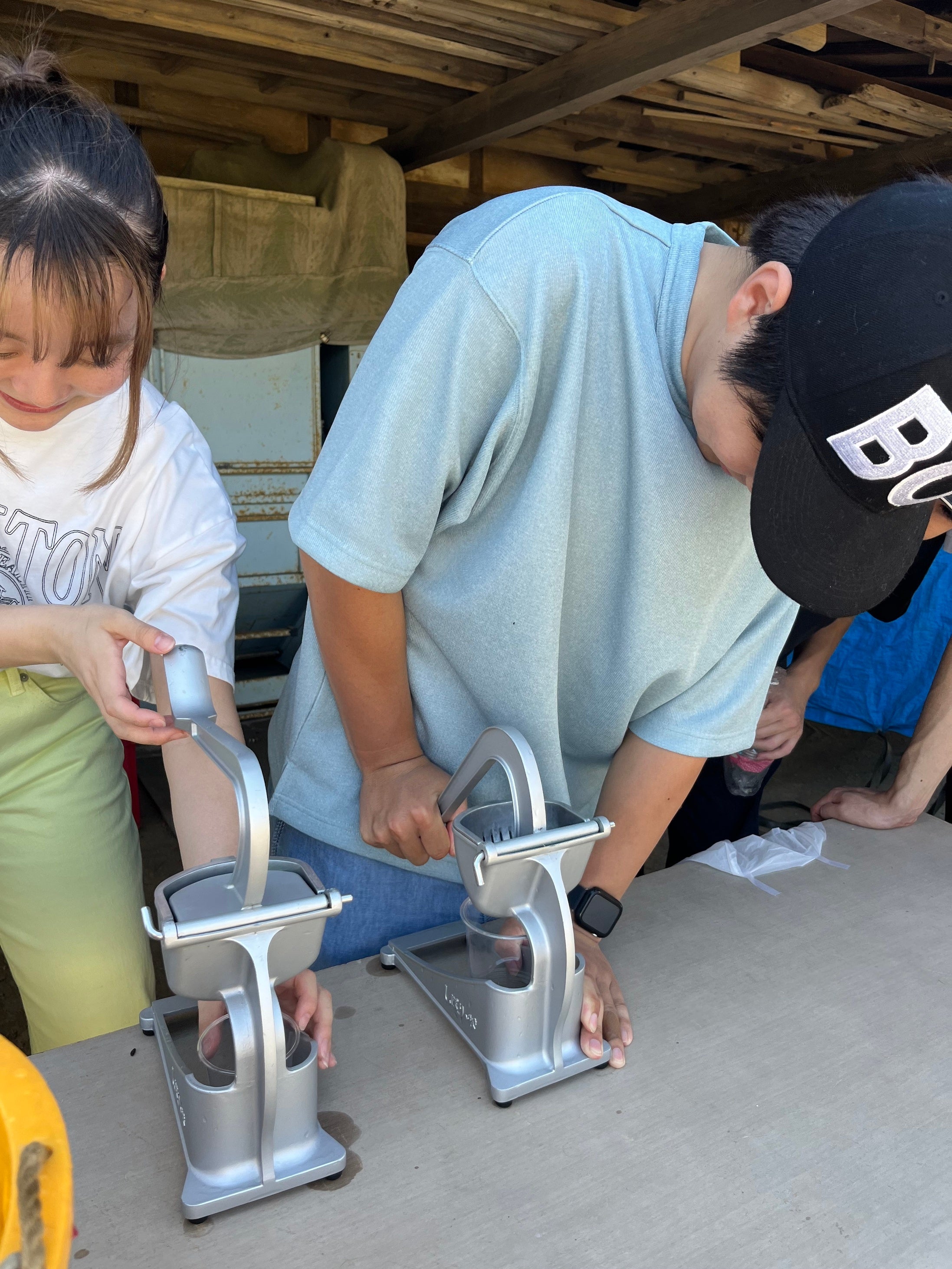 摘果したみかんはその場で絞り、学生たちにジュースとして味見をしてもらいました。酸味の強い摘果みかんは、クエン酸も豊富に入っており、作業後の疲れた体を癒してくれました。この体験を通じて、摘果作業の大変さだけでなく、摘果みかんの商品化への可能性についても学生たちに実感していただきました。