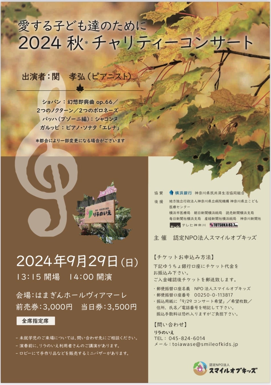 2024年9月29日(日)桜木町はまぎんホールヴィアマーレにて、特定非営利活動法人スマイルオブキッズが、チャリティーコンサート「愛する子ども達のために2024秋」を開催します