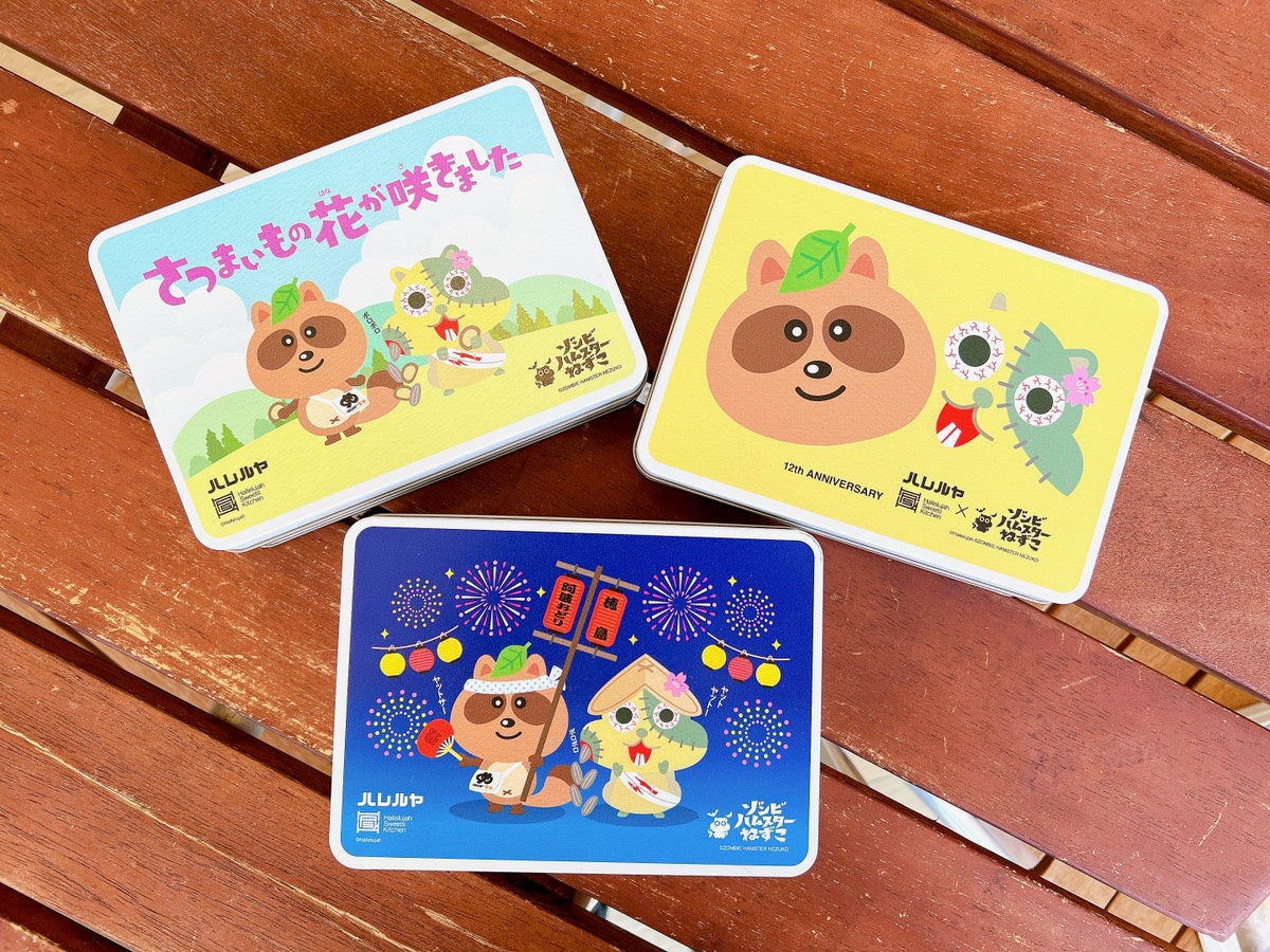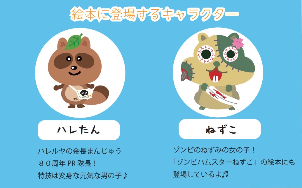 本商品は、人気絵本作家 原田たけし氏の代表作『ゾンビハムスターねずこ』の主人公”ねずこ”と、徳島銘菓「金長まんじゅう」を製造・販売する(株)ハレルヤの人気キャラクター”ハレたん”の2人が主役となったオリジナル絵本の世界観を、お菓子で表現したお菓子缶。