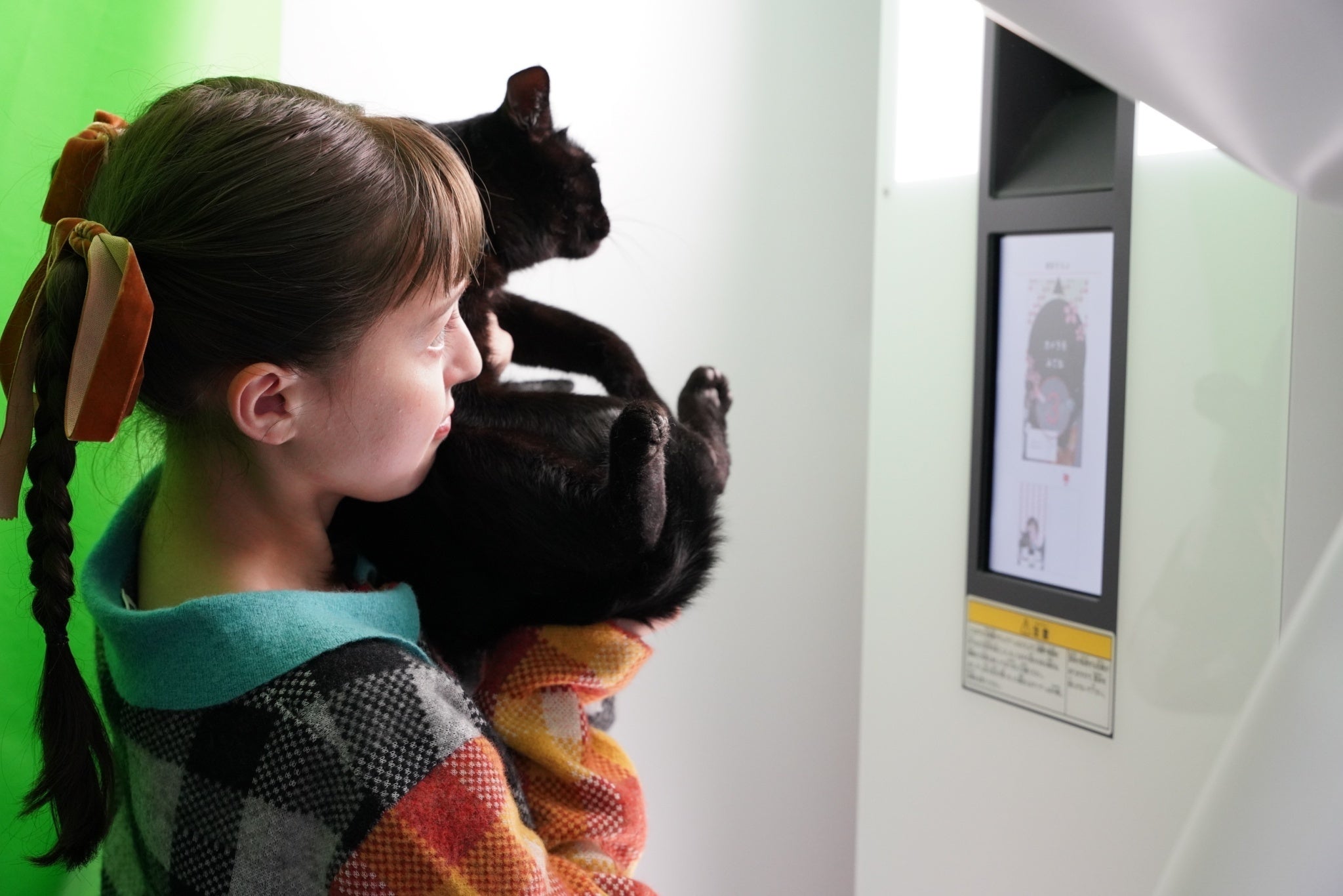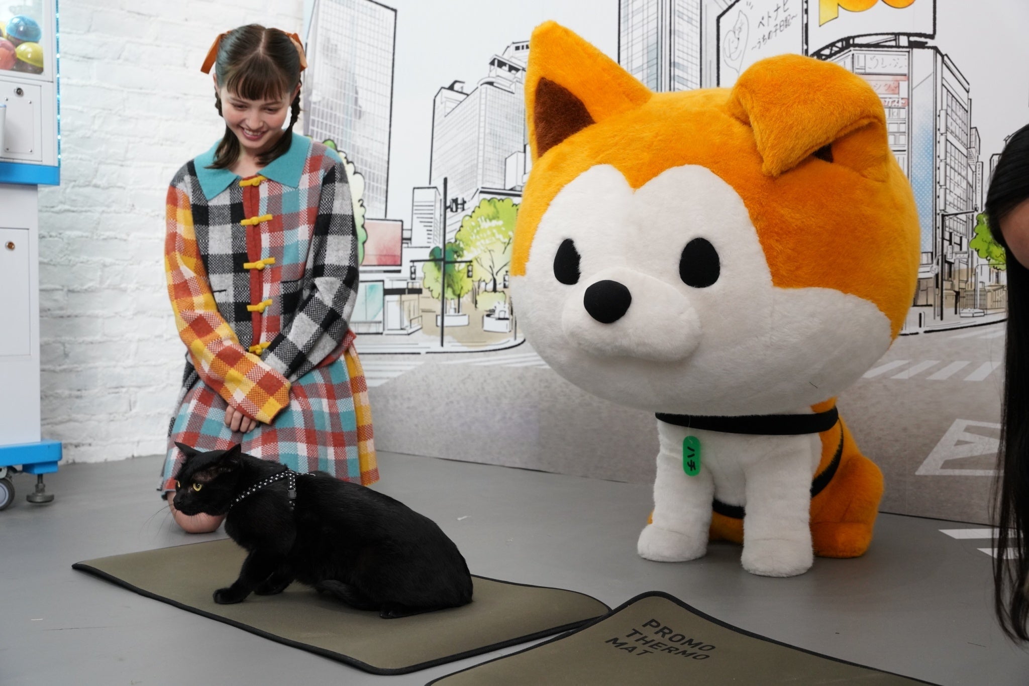 まずは、ハチ公生誕100年をお祝いしたリトル渋谷空間の「ペトナビゲームセンター」へ。ハチ公の生まれ故郷である秋田県大館市の観光キャラクター「はちくん」も登場するプリクラを撮ったり、ブラックシリカの力で病の原因にもなる冷えを防ぐ『プロモサーモマット』わんにゃんゲームをネロくんとショコラくんが楽しみました。加藤さんは「まさかネロとプリクラを撮れるとは!」と大喜び。