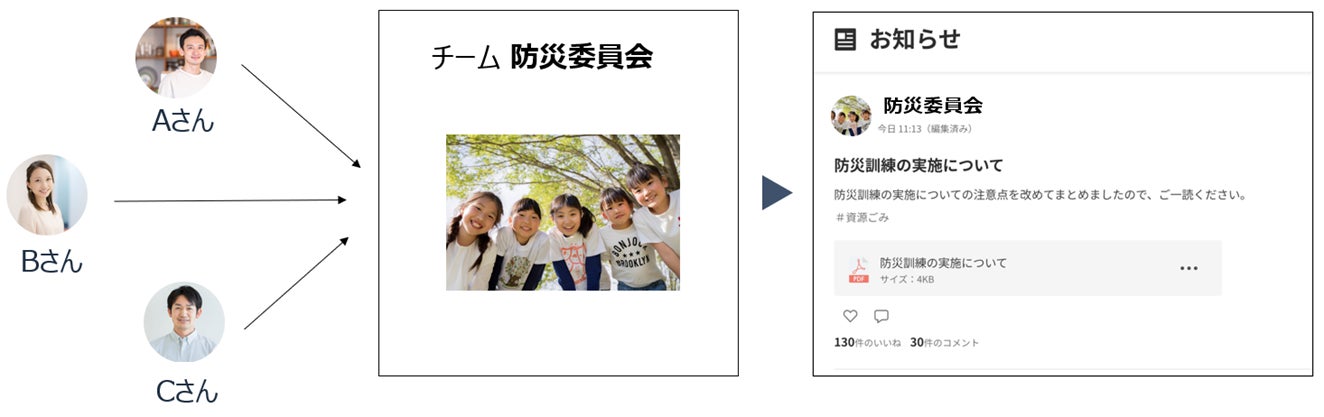 理事会や委員会、管理会社、周辺店舗等の利用を想定し、「個人」としてではなく「チーム」としての投稿を可能とする「チーム方式」を採用しています。アカウントやパスワードの使いまわしによるセキュリティリスクを低減しつつ、所属するチーム名によるお知らせ投稿を実現しました。