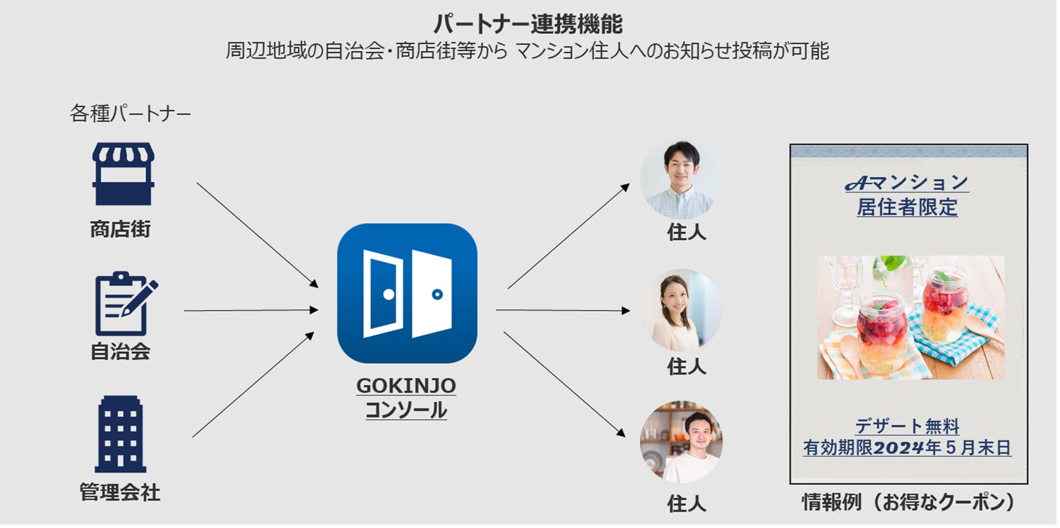 GOKINJOコンソールは、パソコンやタブレットからお使いいただけるWEB版の管理運営ツールです(特許出願中)。パソコンからGOKINJOアプリへのお知らせ投稿や、ユーザー管理、アプリ登録用専用コードの発行が可能です。また、管理会社などの提携パートナーや、近隣店舗などの外部パートナーとの連携機能を備えています。シンプルなUIで、ガイドなしでも簡単に操作できるユーザービリティの高さを特徴としています。この機能により、管理運営の効率化・利便性向上や、各種パートナー・周辺地域との連携を強化することを狙いとしています。