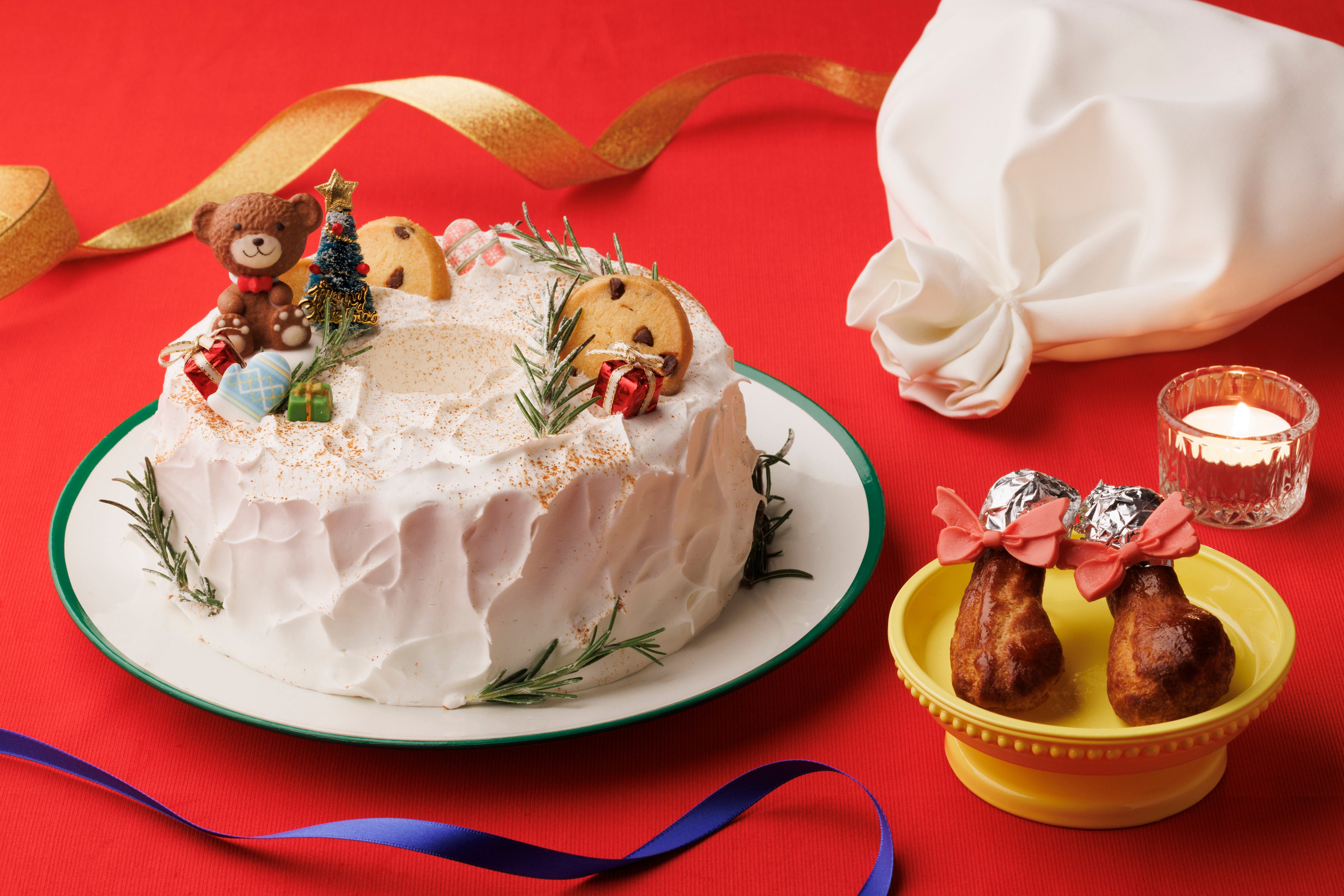 デザートメニューには、蒸気機関車をイメージしたブッシュドノエル、雪景色に佇むイグルー形(氷の家)の苺のショートケーキ、爽やかな柚子の香りが口いっぱいに広がるトンネル形のベイクドチーズケーキなどをご用意しました。まるでクリスマスの定番のチキンのような見た目のシュークリームも登場します。その他クリスマスツリーやソリをイメージしたデザートなど約20種類がビュッフェ台を彩ります。