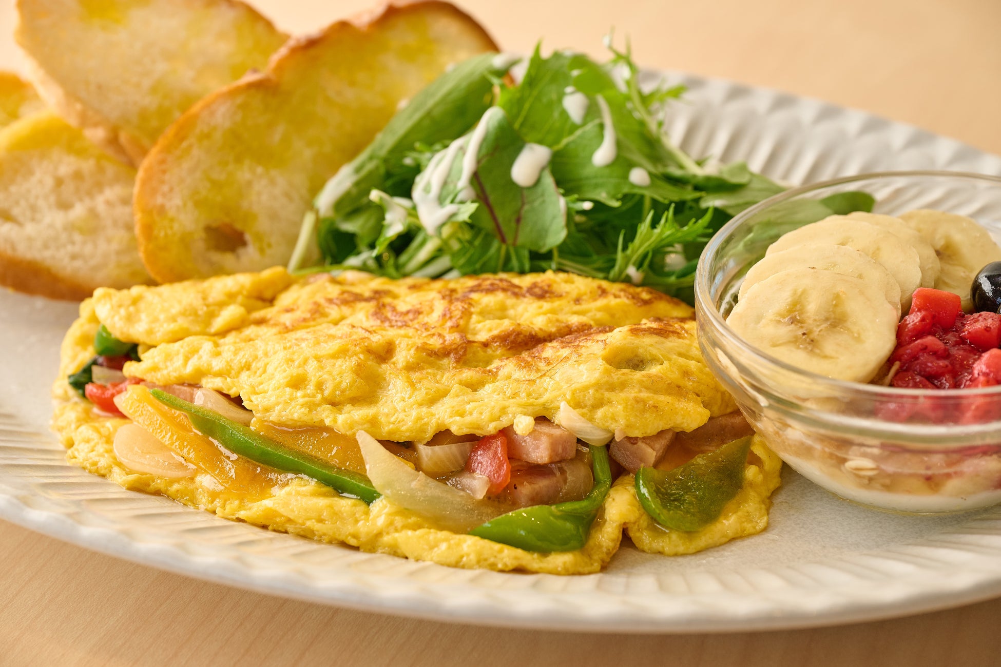 トマト、ピーマン、タマネギ、ほうれん草、チェダーチーズ、スパムを使用したミックスオムレツ。それぞれの野菜のサイズや火入れ加減にもこだわり、どこか懐かしさを感じる味わいです。ライスまたはパンをお選びください。