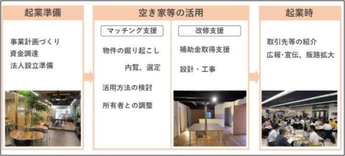 支援することが決定した方に対しては、空き家などの物件のマッチング支援、起業にかかる費用の補助金取得支援、コワーキングスペースの提供など、起業に至るまで伴走型で支援をうけることができます。