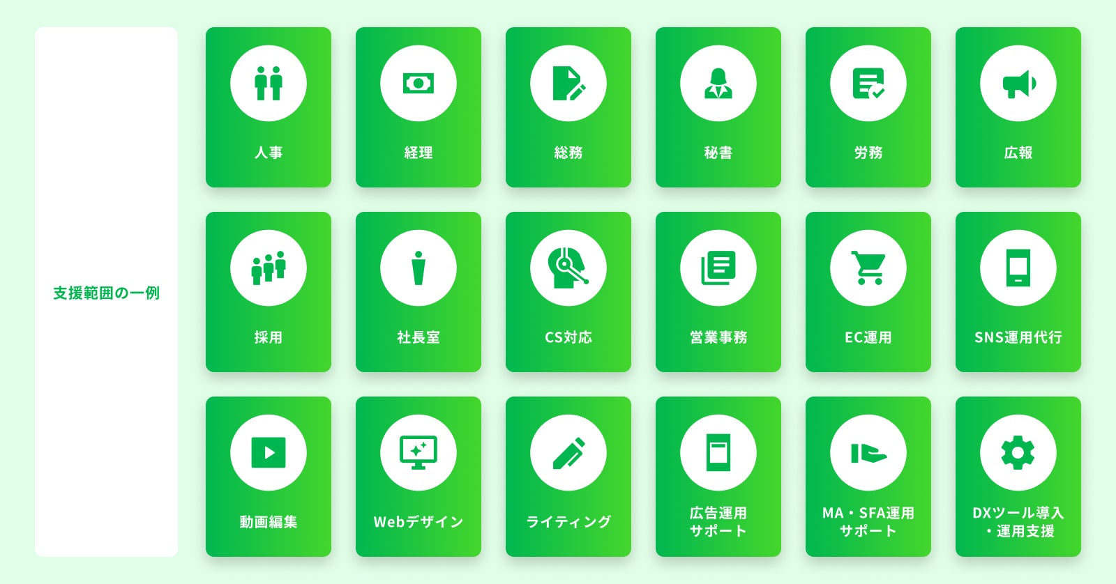 企業で日々発生する煩雑な業務から、EC運用、採用、広報などの専門分野まで最適なチーム体制やツールの利活用によって幅広いオペレーション業務の効率化や自動化を実現