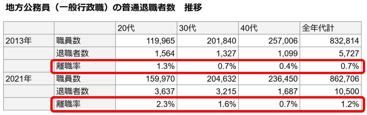 総務省「地方公務員給与実態調査結果 第3表職種別,年齢別職員数」※2・「地方公務員の退職状況等調査」※3 のデータから計算すると、20代、30代の地方公務員の退職率が2013年度と2021年度の比較では20代が1.3%→2.3%、30代が0.7%→1.6%と2倍近く増加しています。民間企業の離職率は11.9%であり、(出展:厚生労働省令和4年雇用動向調査結果の概況)、民間企業と比べれば依然低いものの、公務員若手世代のキャリアに対する意識の変化が伺えます。