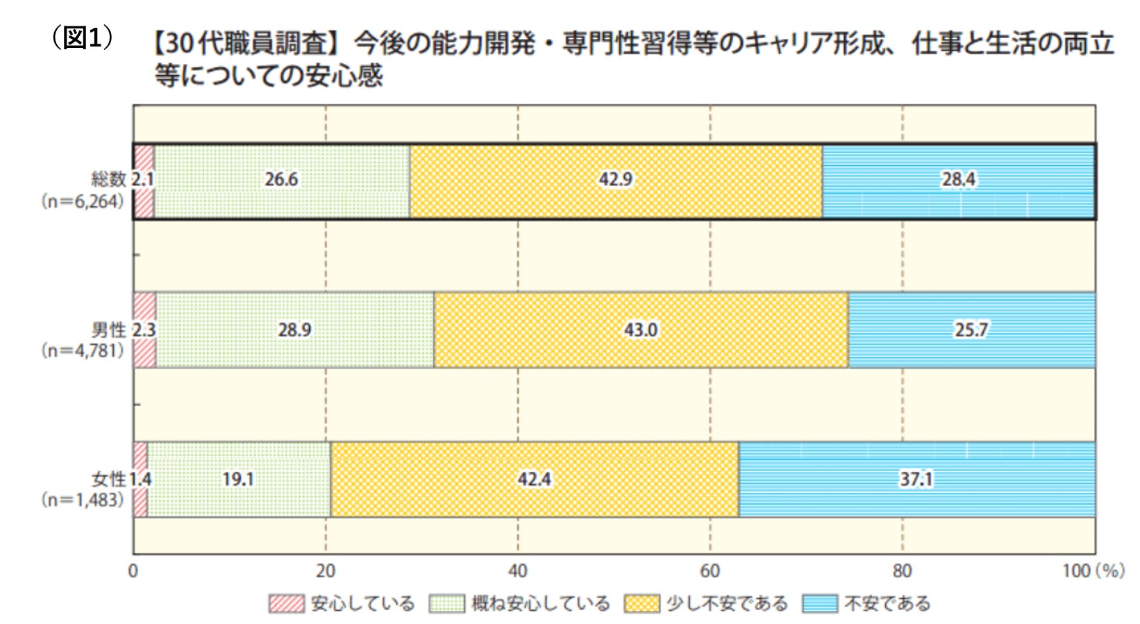 国家公務員の人事管理を担当する人事院の「次世代の行政の中核を担う30代職員の育成と公務全体の活性化」調査※1 によると、30代公務員の71.3%が自身のキャリアの展望や仕事と生活の両立に対して不安を感じているという結果が出ています。(図1)