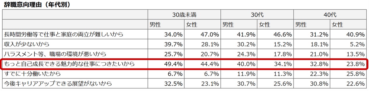 内閣官房の「国家公務員の⼥性活躍とワークライフバランス推進に関する職員アンケート結果」※4 によると、若手職員の辞職の理由として「もっと⾃⼰成⻑できる魅⼒的な仕事につきたい」が上位に挙げられています。特に、30歳未満はその傾向が顕著であり、30歳未満男性では約半数を占めています。