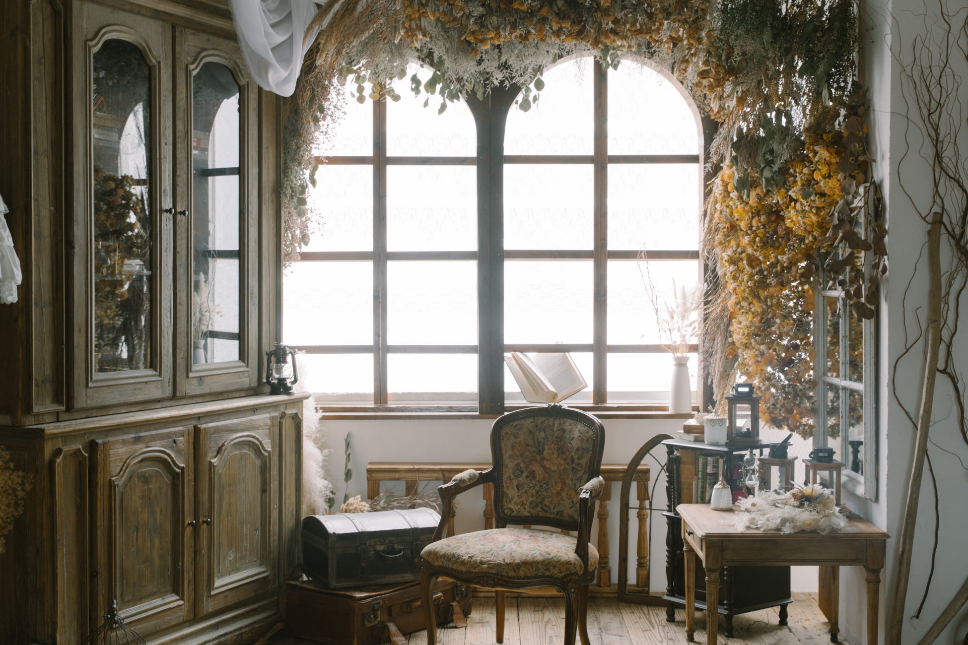 総面積70㎡超のゆとりある空間に、西洋より受け継がれたアンティーク家具を実際に配置し、心地よい自然光とドライフラワーがスタジオ全体を彩ります。