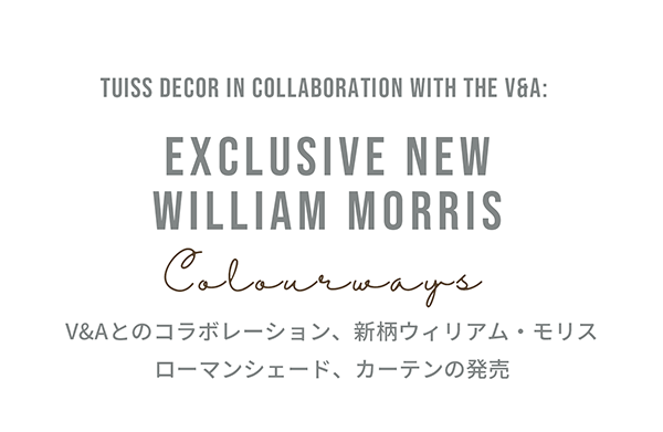 TUISS DÉCOR(チューイッシュ デコア)は、V&Aウィリアム・モリスのコレクションに新たに3柄とスタイル5種類を発表いたします。ロンドンのV&Aとのコラボレーションで開発したウィリアム・モリスの柄はローマンシェードとカーテンとして、2024年4月15日(月)に発売いたします。