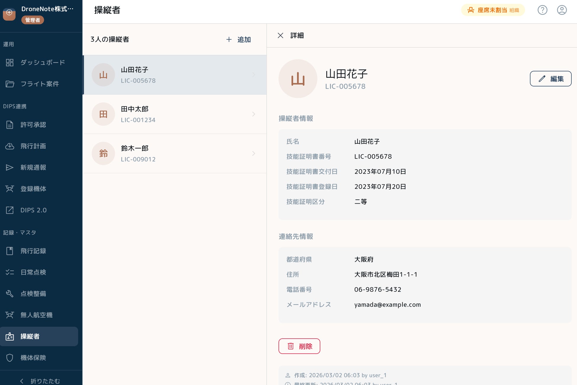 機体(無人航空機)と操縦者の情報をWeb管理ポータル上で登録・編集し、組織メンバー間で共有できます。モバイルアプリとのデータ連携により、現場での入力負荷を軽減します。