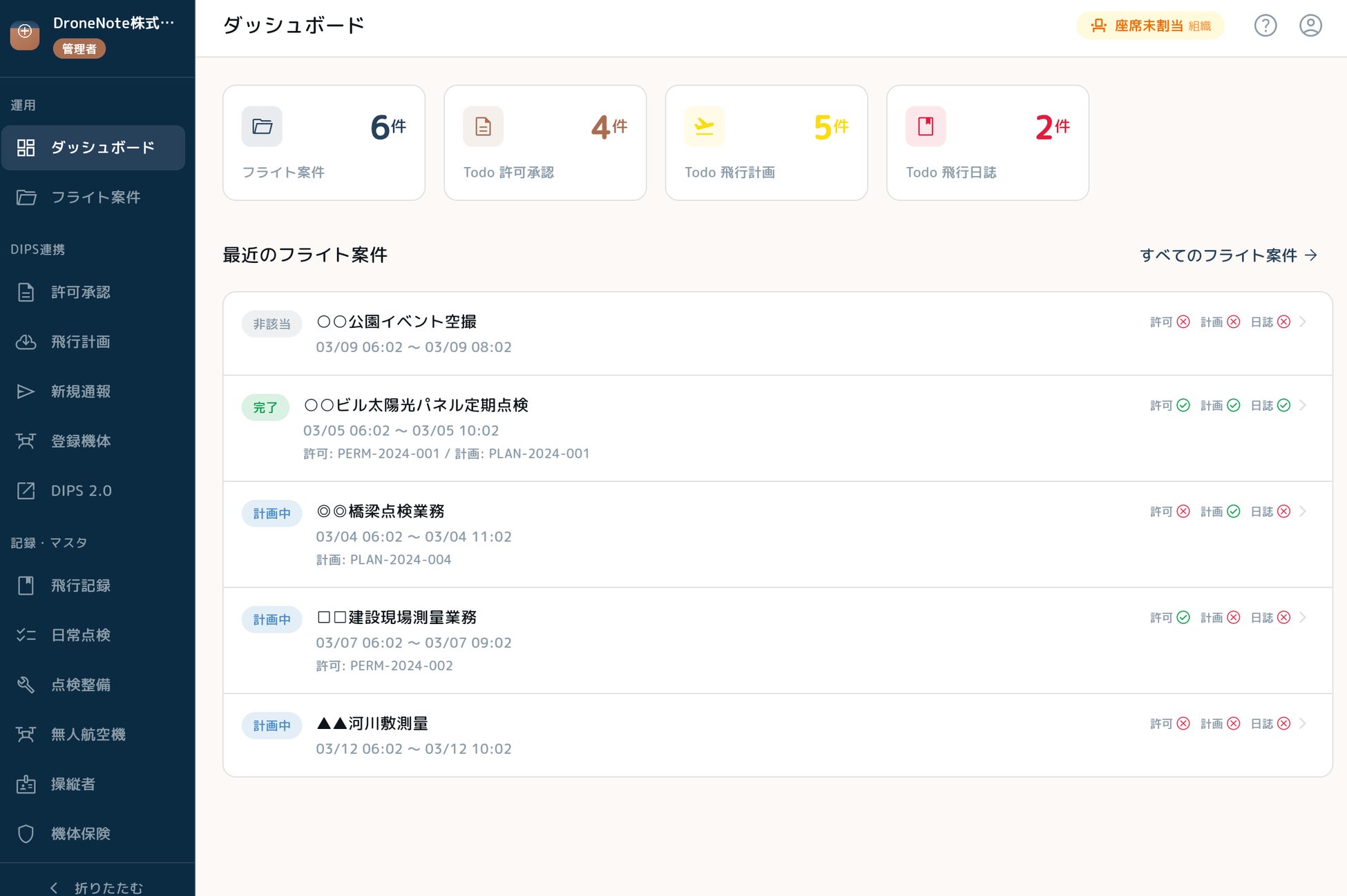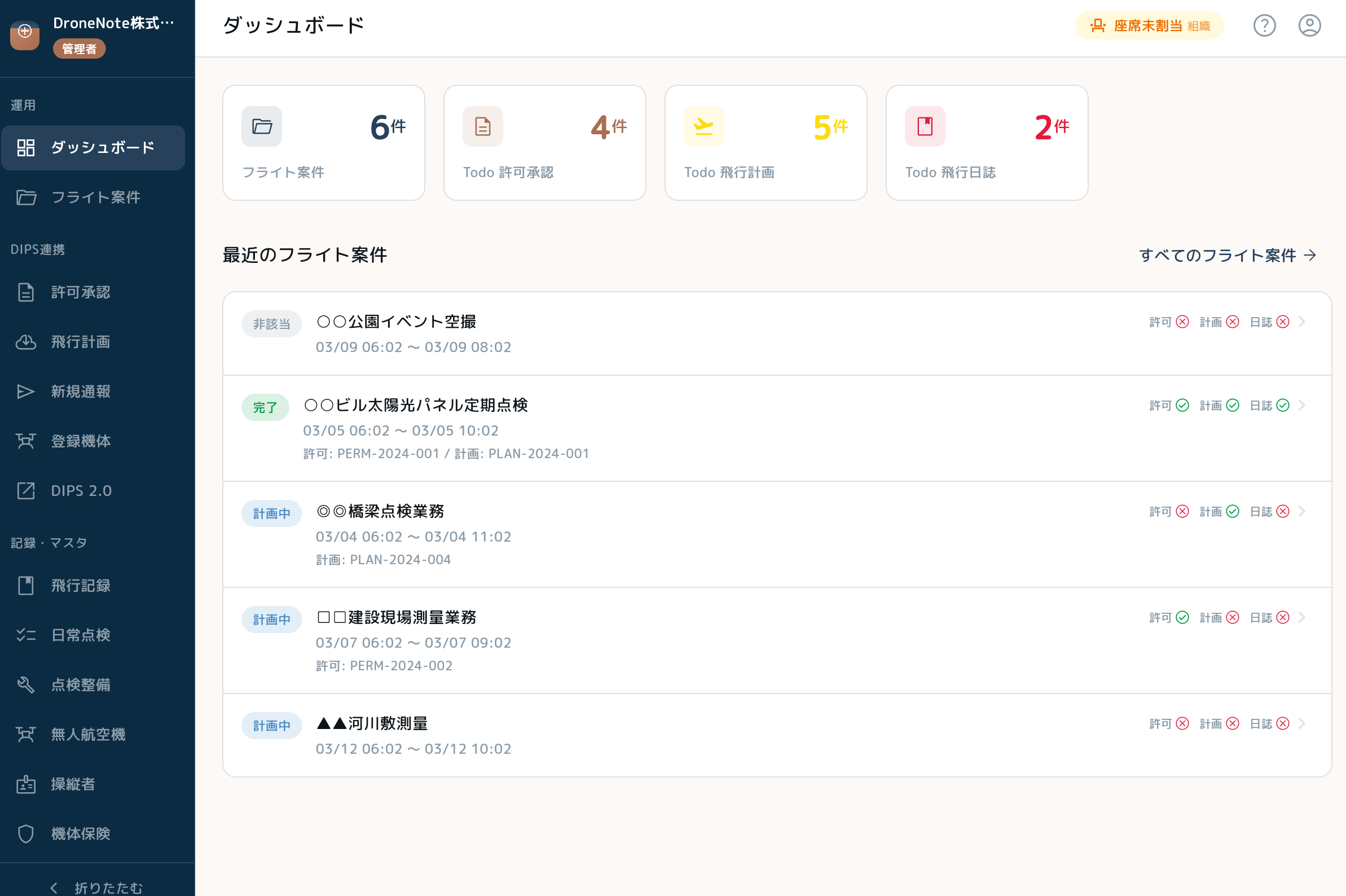 飛行計画を事前に登録して組織内で共有できます。飛行許可・飛行計画・飛行日誌の各ステータスを一覧で把握でき、申請忘れや記録漏れの防止に役立ちます。