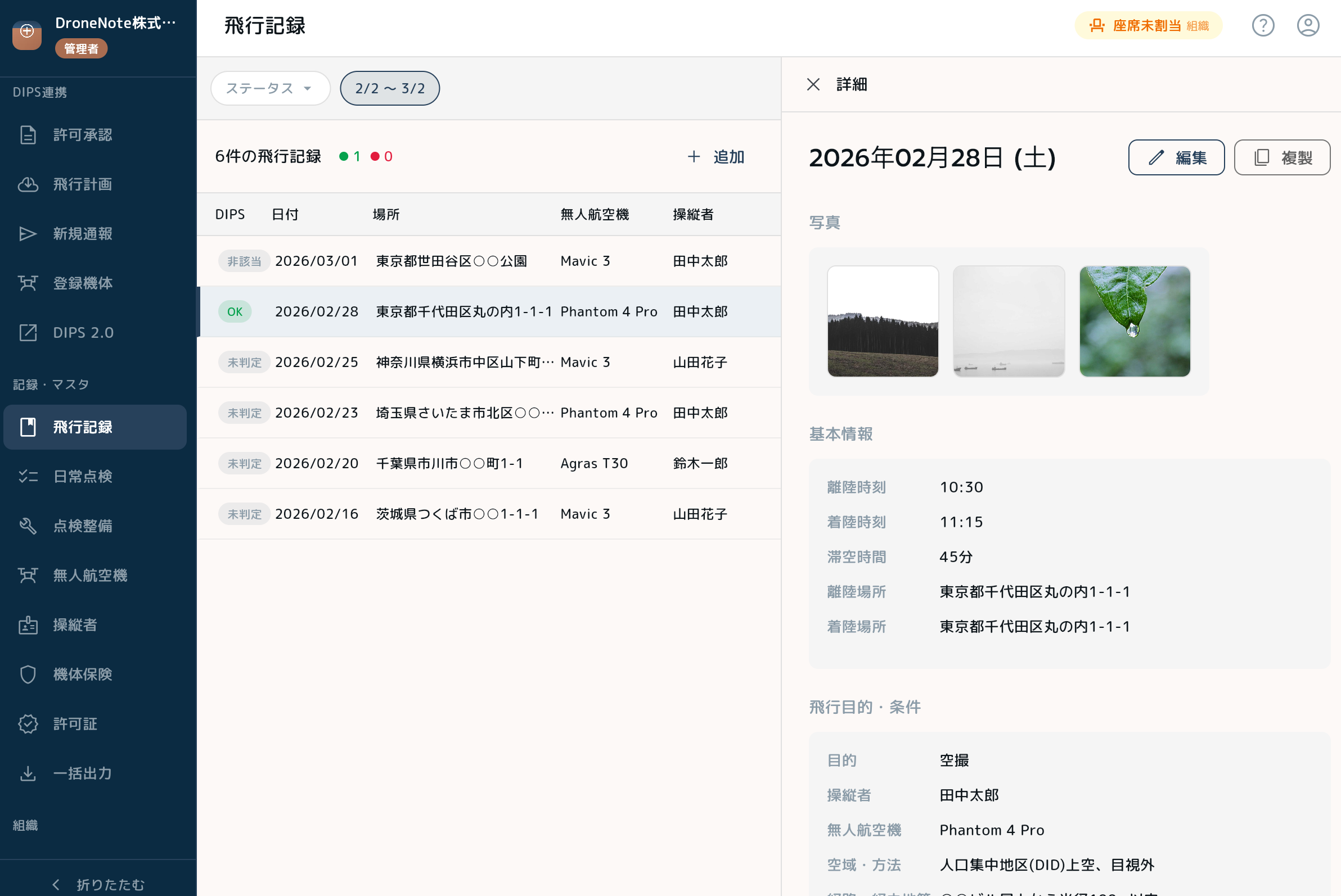 国土交通省のドローン情報基盤システム(DIPS 2.0)と連携し、飛行許可承認・飛行計画・機体登録情報をポータル上で確認・管理できます。飛行計画の通報にも対応しており、DIPSに登録済みの情報と飛行日誌の紐付けにより、法令遵守状況を一目で把握できます。