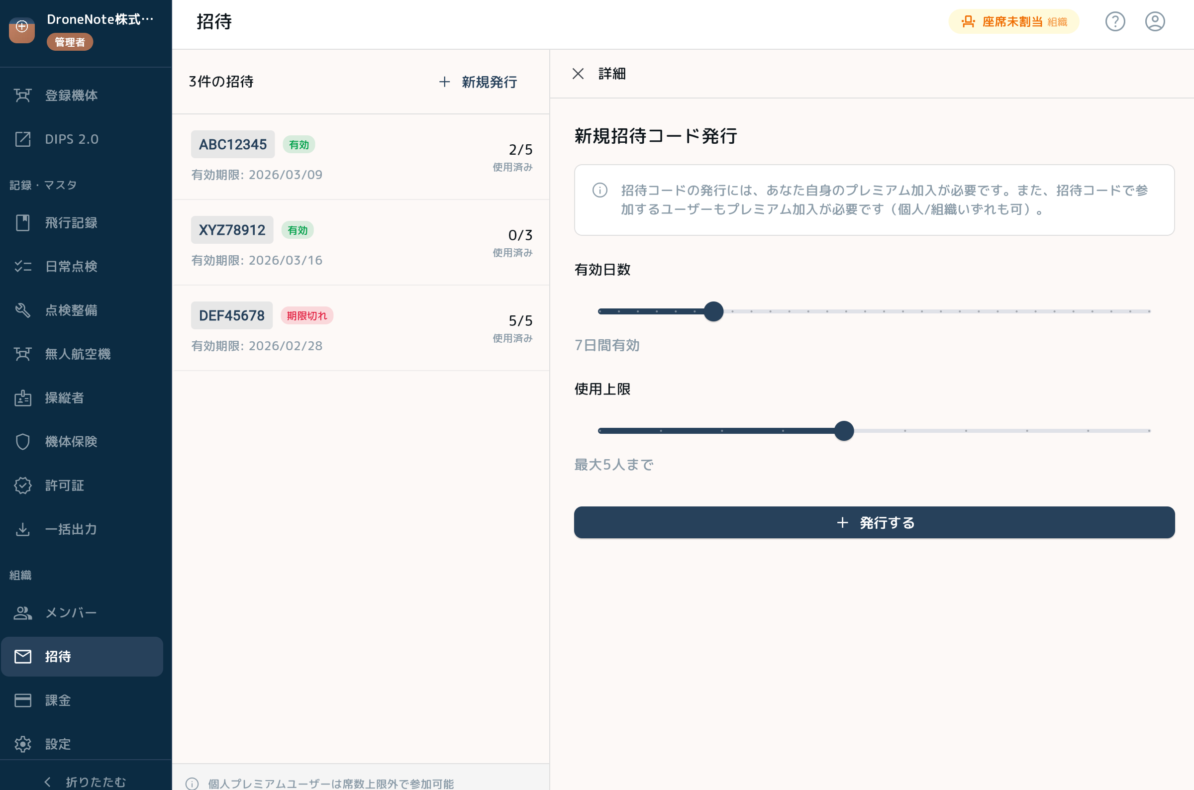 Web管理ポータルの機能は、法人・団体だけでなく個人のプレミアムプランユーザーにもご利用いただけます。組織共有機能を除き、DIPS連携やCSV・PDF出力、フライト案件ダッシュボードなど、主要機能を個人アカウントでもお使いいただけます。