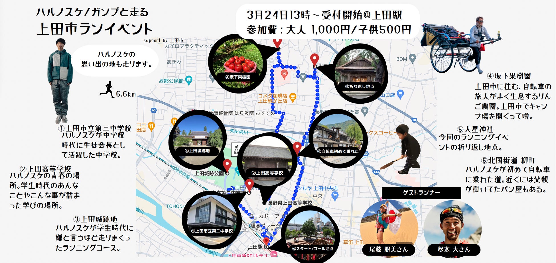 人力車で世界を走るガンプ鈴木は今回、3/18〜3/24に上田市役所を出発し長野県内を走ることが決定した。今回は自身のドキュメンタリー映画を上田市にて上映を行うにあたり長野県内を走る。
