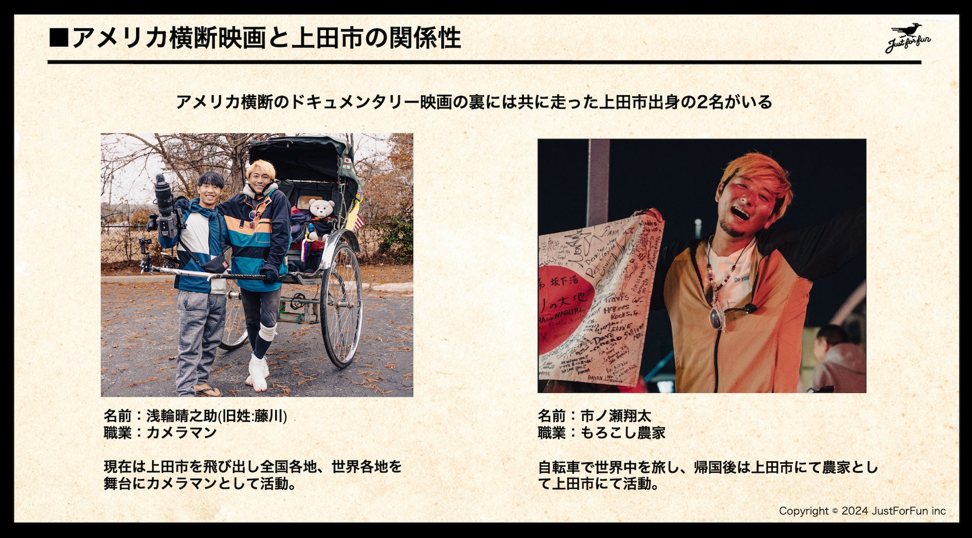 上田市は今回の映画に最もゆかりのある土地であり、本作品の撮影から編集まで務めた浅輪晴之助監督と、ガンプ鈴木と共にアメリカ縦断を行った市ノ瀬翔太の地元であり、今回の上田市での映画上映は彼らの2人の強い思いから今回の開催が決定した。