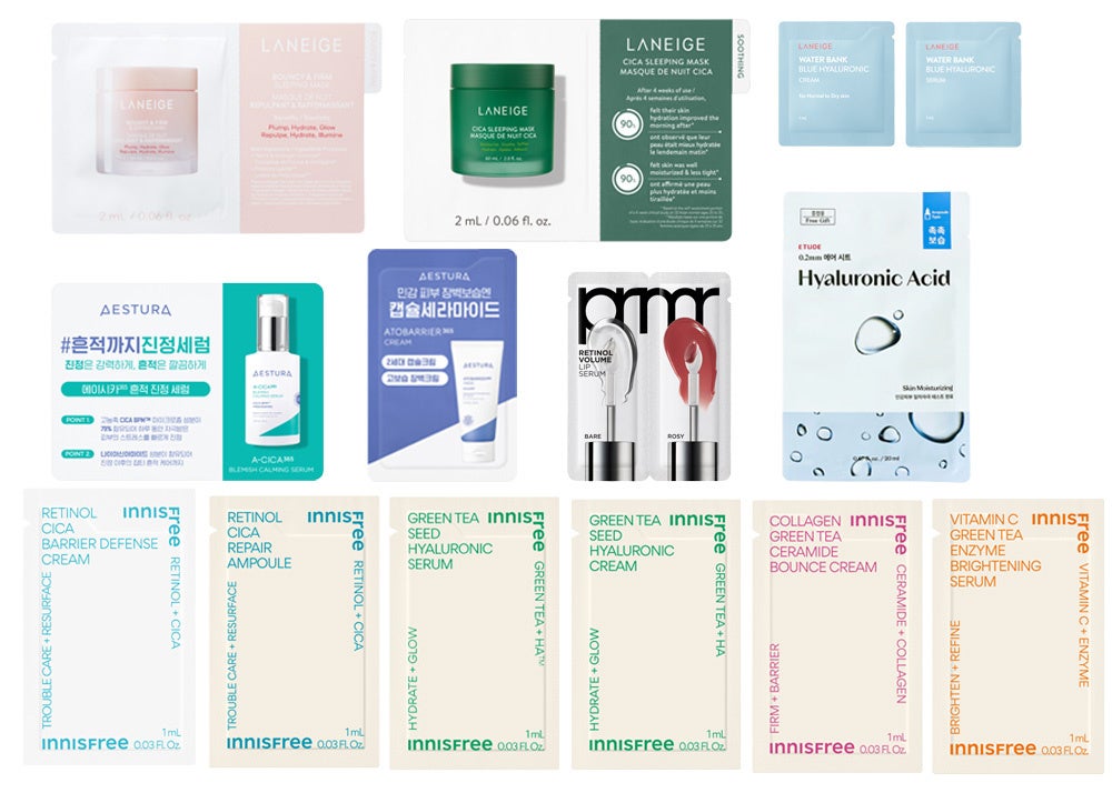 対象のブランドで3,300円(税込)以上購入された先着1,000名様に人気商品のサンプル14点セットプレゼント (対象ブランド:INNISFREE、LANEIGE、ETUDE、AESTURA、primera)