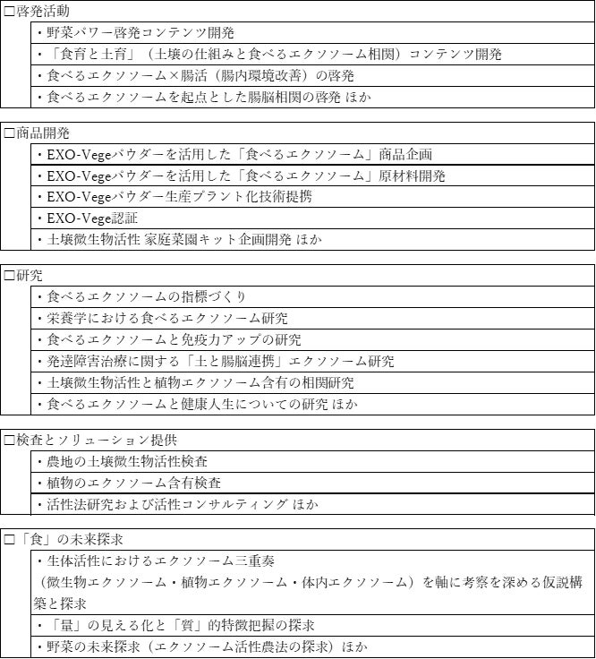 生活者ひとり一人が、「医食土同源」に根ざした「食」と“食べるエクソソーム”のあり方を学び、選択することで健康人生(リジェネライフ)を手にし、同時に地球環境のリジェネレーションを実現する経済活動モデルを築くこと。