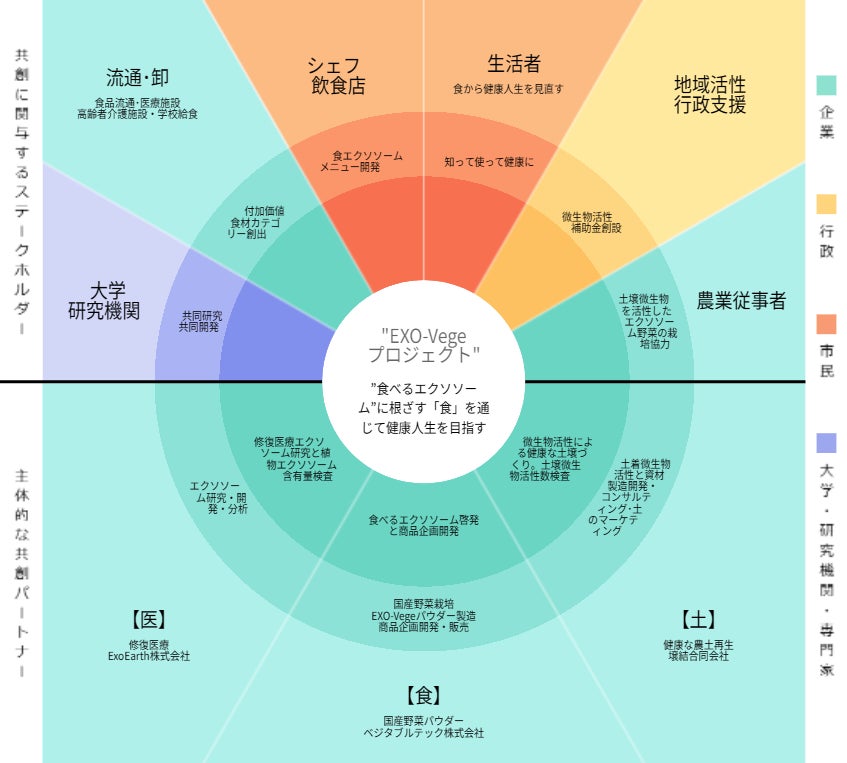 土壌の微生物活性によって新しい土づくりを実践する壌結合同会社(よみ:つちむすび、本社:東京都千代田区、代表社員:金瀬 伸吾)、テクノロジーと栄養学を融合させた国産野菜パワーを提供するベジタブルテック株式会社(本社:広島市西区、代表取締役:岩崎 真宏)、および修復医療エクソソームとテロメア研究に基づく「細胞活性メソッド」で健康長寿社会を創造するExoEarth株式会社(よみ:エクソアース、本社:東京都港区、代表取締役:西平 隆)は、『医食土同源』をテーマに“食べるエクソソーム”分野の開発に向けた共創プロジェクト「EXO-Vege プロジェクト」の発足に関する業務提携を締結したことをお知らせいたします。