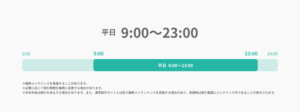 取引可能時間帯である平日09:00-23:00(日本時間)の間であれば注文が可能で、取引板上に存在する買い手・売り手双方の価格が合致していれば即時に約定します。