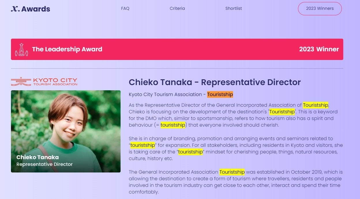 一般社団法人ツーリストシップ(本社:京都市上京区)は、2023年12月にイギリスで開催されたX.Awardsで、リーダーシップ賞を受賞したことにあたり、代表田中千恵子のコメントを掲出します。