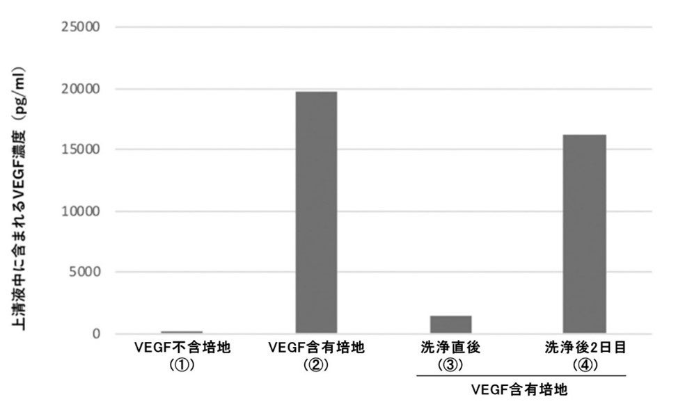 組み換えVEGF含有または不含培地で細胞培養を行った後、上清液中のVEGF濃度を測定した。培養直後の上清液に含まれていたVEGF(②)と比較して、PBS洗浄直後では(③)、VEGF不含培地(①)と同程度までVEGF濃度が低下していた。しかしながら、その後VEGF不含培地で2日間培養(④)を継続すると、上清液中のVEGF濃度は再び上昇した。