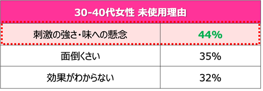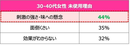 製品開発にあたって、マウスウォッシュを使ったことのない30-40代女性へ調査を実施したところ、マウスウォッシュを使用しない理由として、「刺激の強さ・味の懸念」が44%と最も多く、使用感への課題が非常に大きいことが明確になりました。そこで、私たちは「リステリン®」の強みである殺菌力はそのままに、刺激の強さや味が苦手な方でも、毎日使いたくなるようなマウスウォッシュを開発しました。