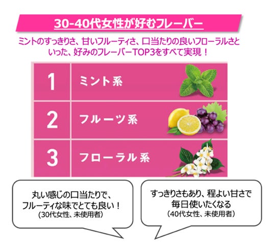 フレーバーは、すっきりとしたミント系、甘いフルーツ系、口当たりの良いフローラル系といった、30-40代の女性の好みのフレーバーTOP3をベースに、“毎日使いたくなる”製品を目指し、日本の女性のために初めて一から開発しました。口に入れた瞬間フローラルな香りがふんわりと香り、ゆすぐと心地よいひんやり感と同時にフレッシュで透明感のあるフルーティーな味わいがお口いっぱいに広がります。これまでマウスウォッシュを使ったことがない女性の方からも、味に対して非常に好評をいただいております。
