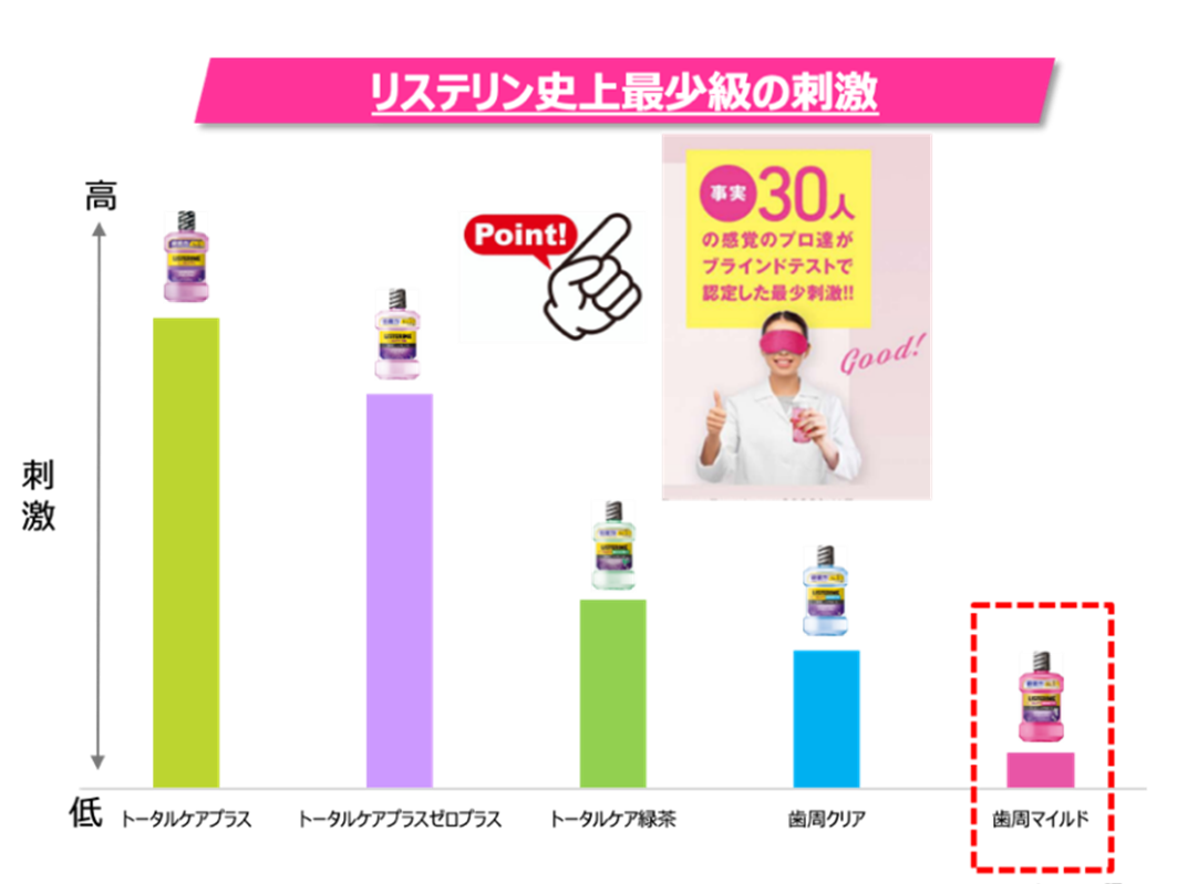 「リステリン®トータルケアシリーズ」の中でも、新製品「リステリン®トータルケア 歯周マイルド」は、“最も刺激が少ない“と、30名の感覚のプロが認定。「リステリン®」史上※1最少級の刺激を実現しました。
