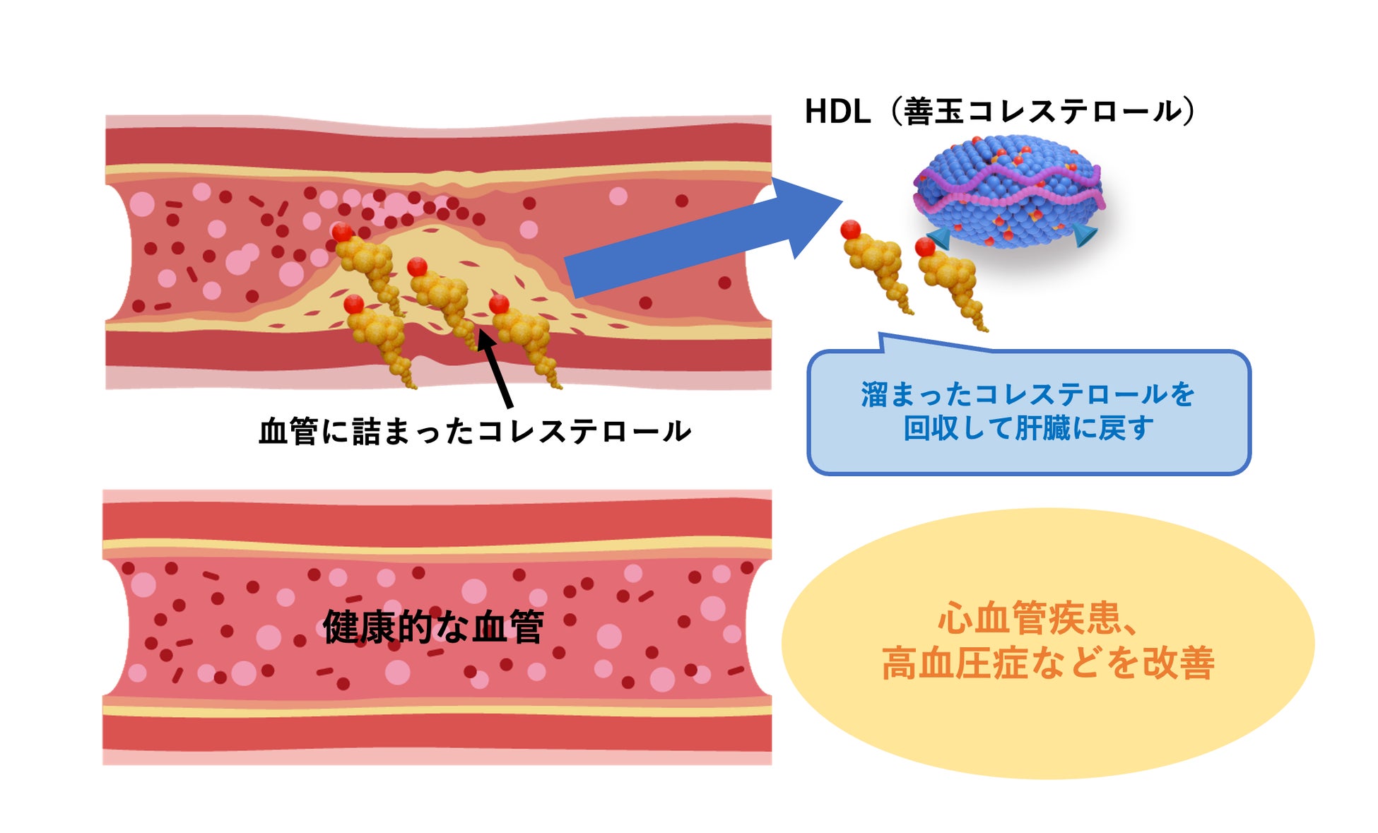 HDLの血管などに詰まったコレステロールを引き抜く能力(CEC)が大幅に向上しました。これは、既にある血管プラークを解消するなど、心血管疾患のみならず高血圧症の改善にもつながります。
