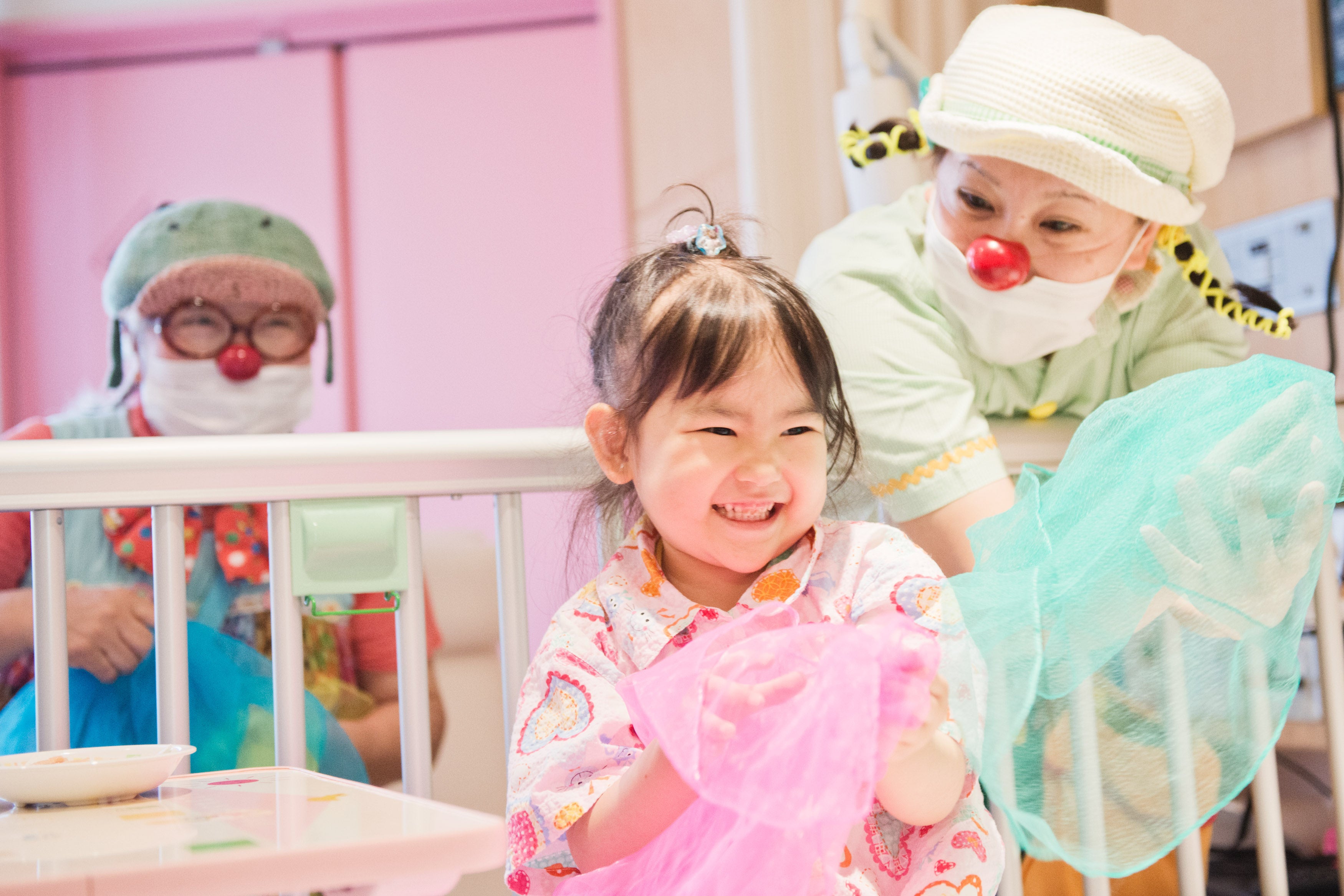 病気の治療のためにさまざまな制限の中で入院生活をしているこどもたちが思いきり笑い、主体的に遊ぶことのできる環境をつくること、それがクリニクラウンの役割です。